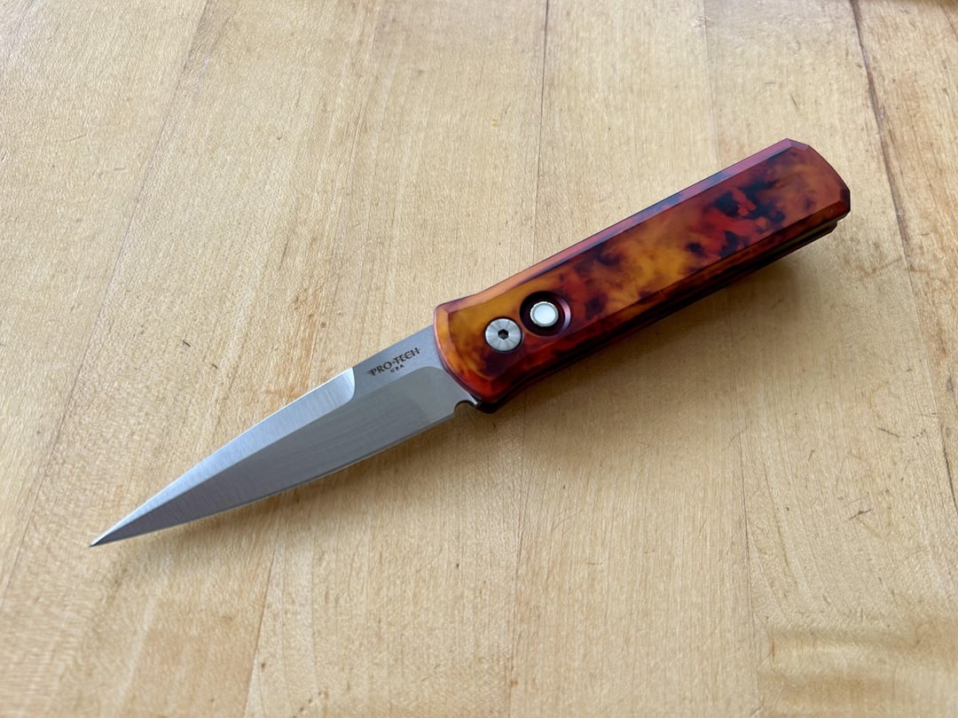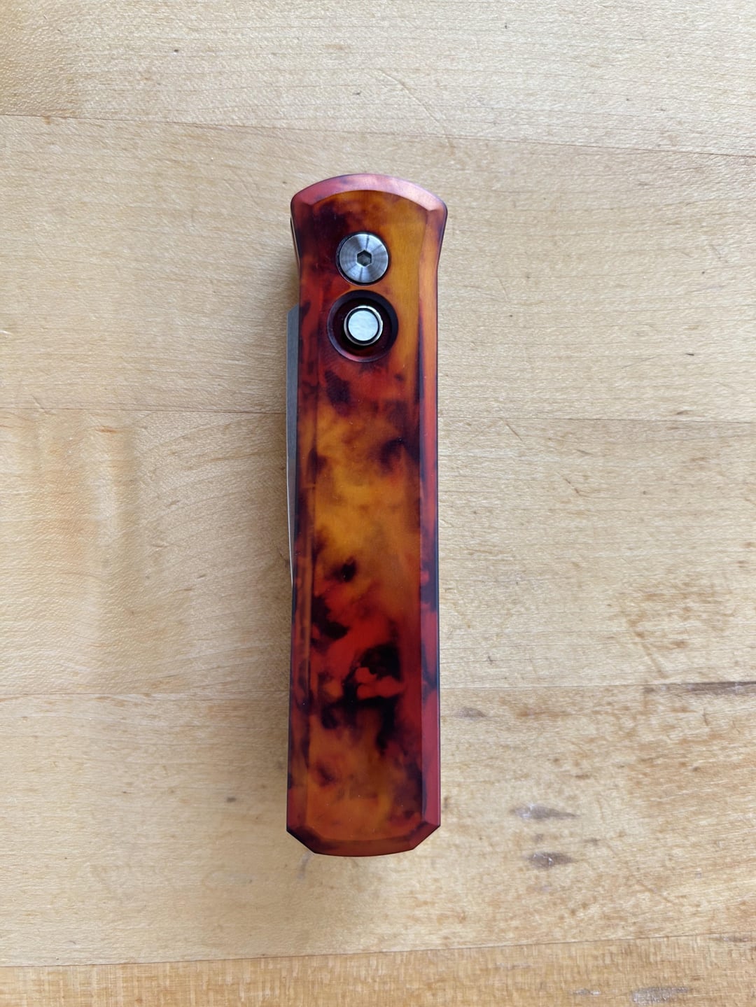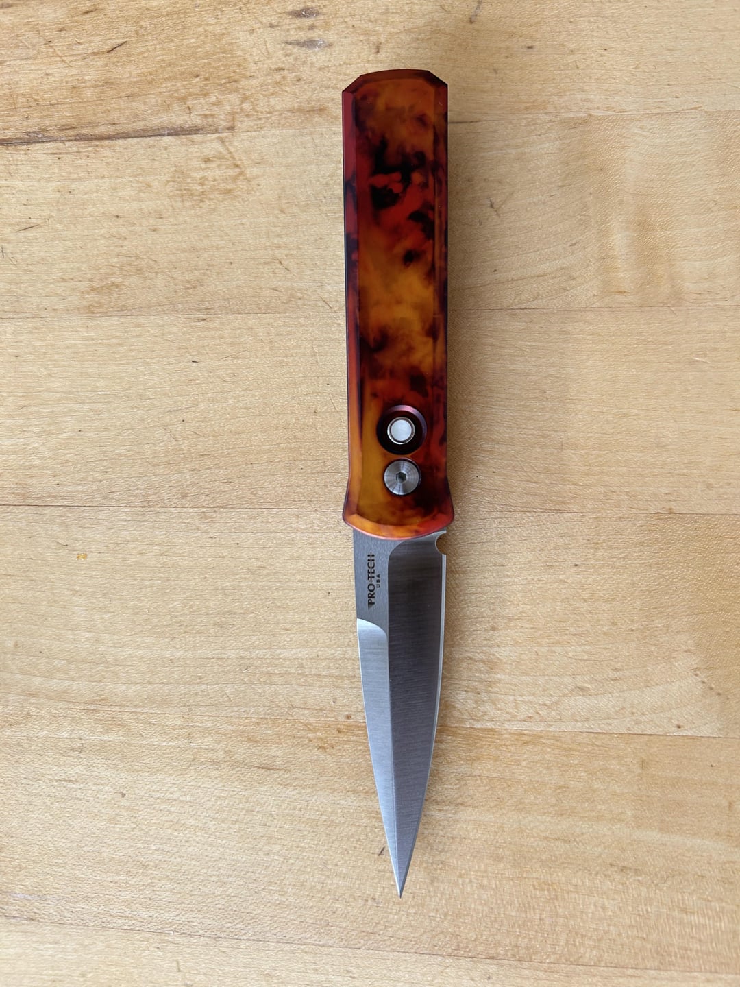 The design is like a burning flame. The button is with perlmutt inlays. The finish is flawless. The actual from another world/shocking. I’m not allowed to carry it in my country but at least I can have it home.