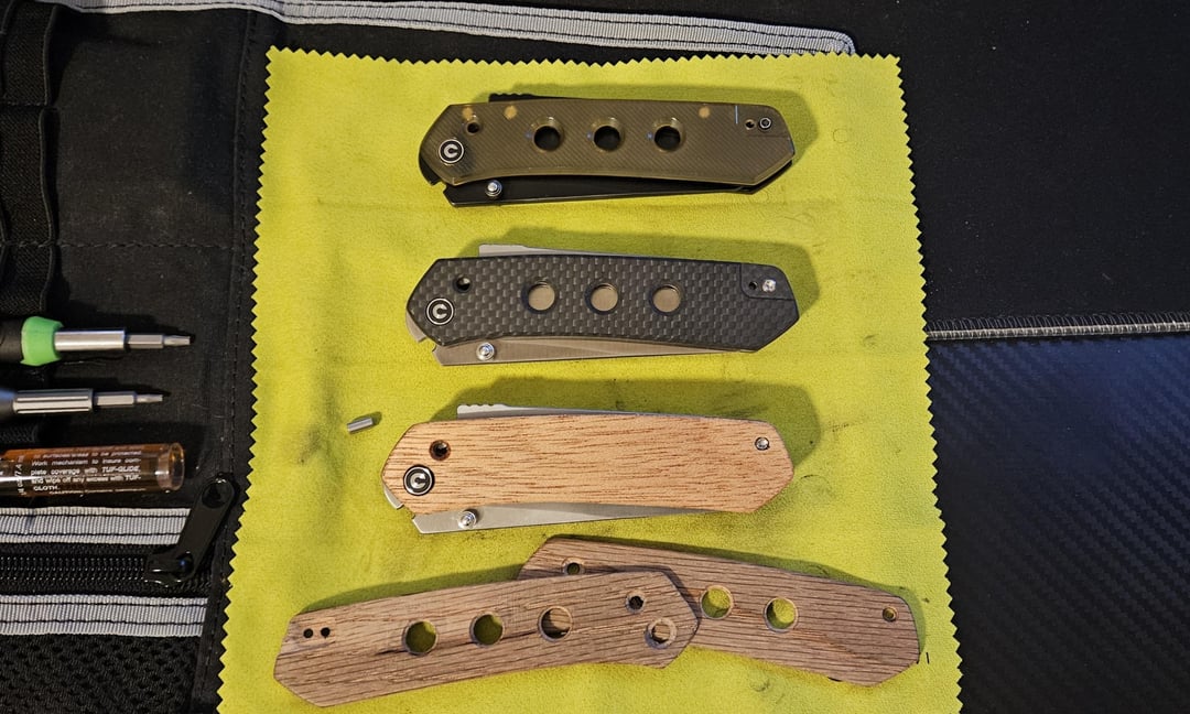 I love the civivi vision fg. Clearly. After tackling my first set of handmade scales (uncoated, but well used oak at the bottom of the photo) I was a bit more confident going into the 2nd set. Went with a mahogany I had lying around and finished them with an avocado oil rub. Definitely turned out nicer than the first set, although I definitely still had some minor screw ups. Overall I’m pretty happy with the turn out. Gotta get some practice in before I try with more expensive materials. While I had it apart I removed the lockbar stop pin so it would be like the vision r just to try it out. Probably not gonna like that in the long run though.