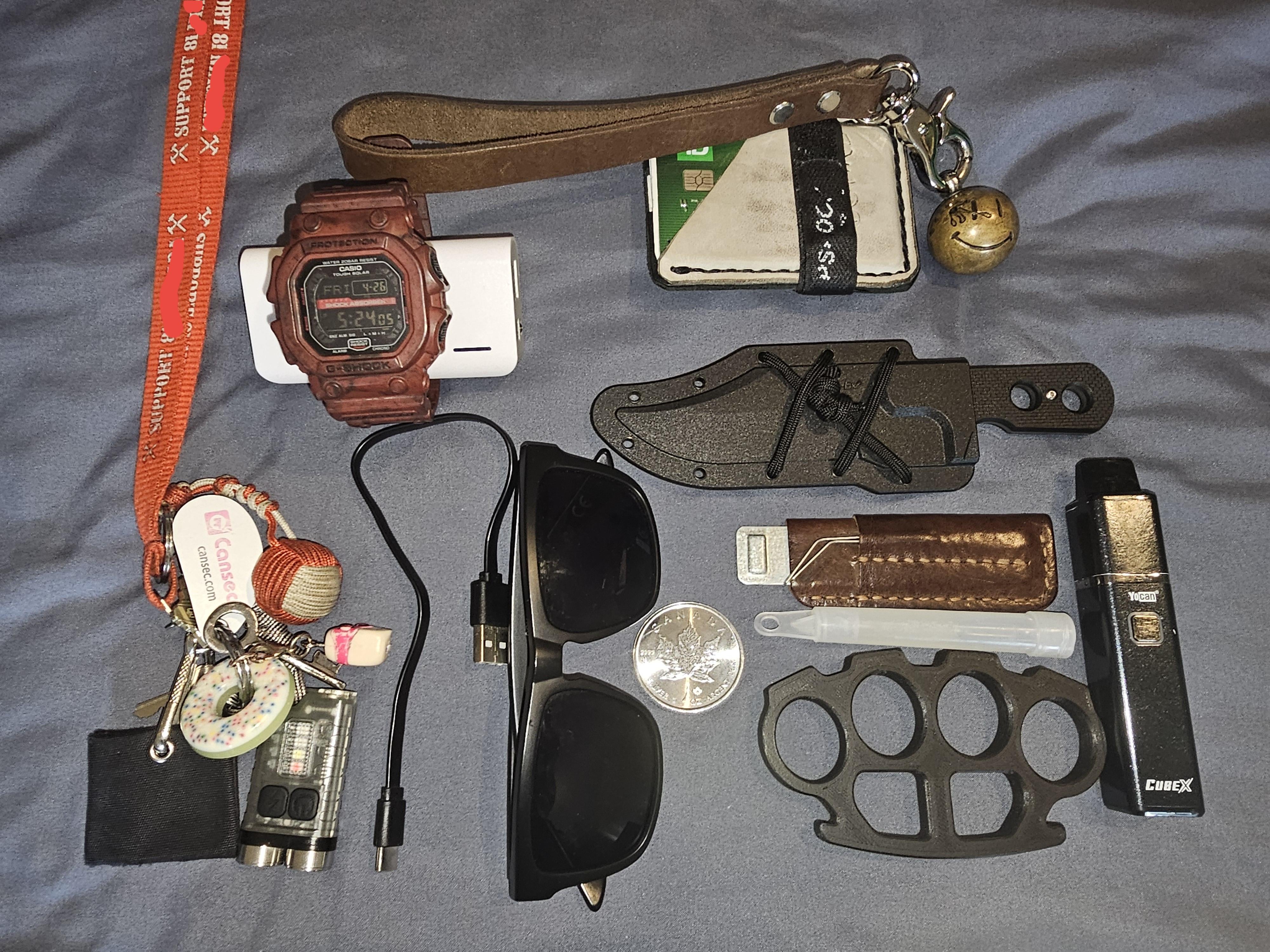 CF knucks from Monkey Knuckles. Cold Steel Mini Tac. Borlit V3 light. Citizen E Glonut. KLNY Collective wrecking ball, inspired by The Comedian. 1oz silver coin. GShock GX56. Bogota picks with box cutter. DIY mini wallet. Power bank with light. Glow stick. Cheap sunglasses to lose or break by the weeks end.