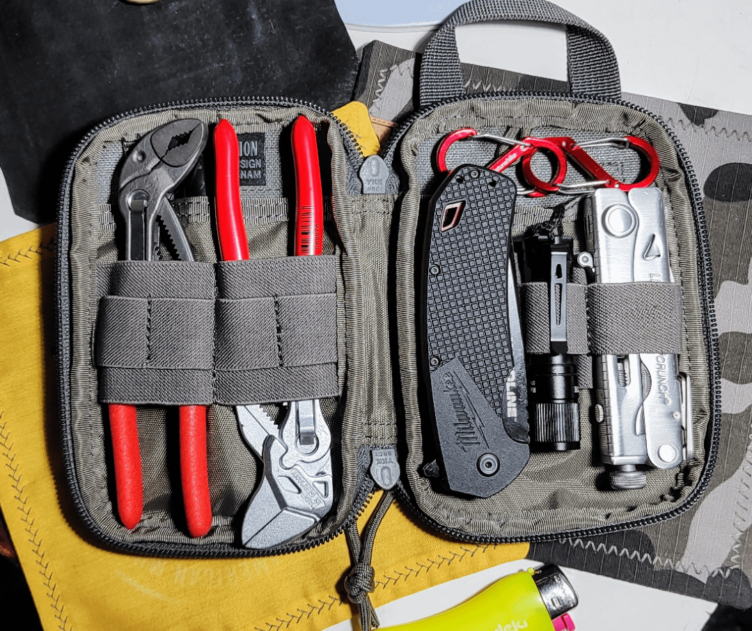 potato-smasher89 2 years ago List of items:Knipex Cobra 150, Knipex Pliers Wrench 150, Sharpie marker, Zip ties (don’t showed), Duct tape (don’t showed), A couple of carabiners, Milwaukee Hardline D2 steel, Thrunite Ti Pro flashlight, Leatherman Crunch,