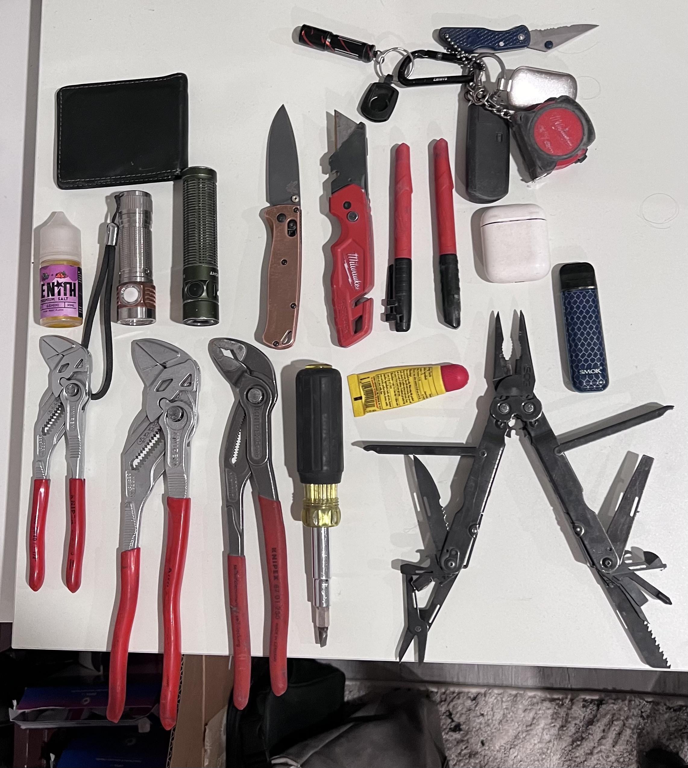Milwaukee fastback, i3e eos keychain flashlight, car keys, cheap keychain knife, Milwaukee 6ft keychain tape measure, 1st gen AirPods, 6in flat knipex pliers, 10in flat knipex pliers, 10in knipex cobra pliers, Klein 11 in one hvac screwdriver, SOG power access