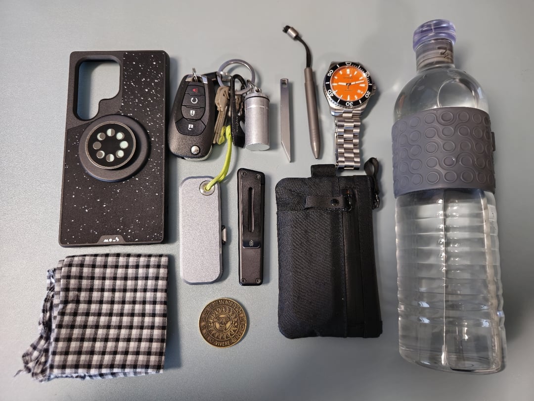 Samsung Galaxy S24 Ultra, Mous Limitless 5.0 Magsafe case, Popsocket Magsafe attachment, Niteize keychain multi tool, waterproof pill case, mighty bar, Big Idea Design Ti Mini Pen, Shinola Monster Automatic Watch, Ello Percy Water bottle, Target handkerchief, The James Brand Palmer utility knife, TJB Chapter knife, Alpaka Zip Pouch Pro, Custom Brass Coin