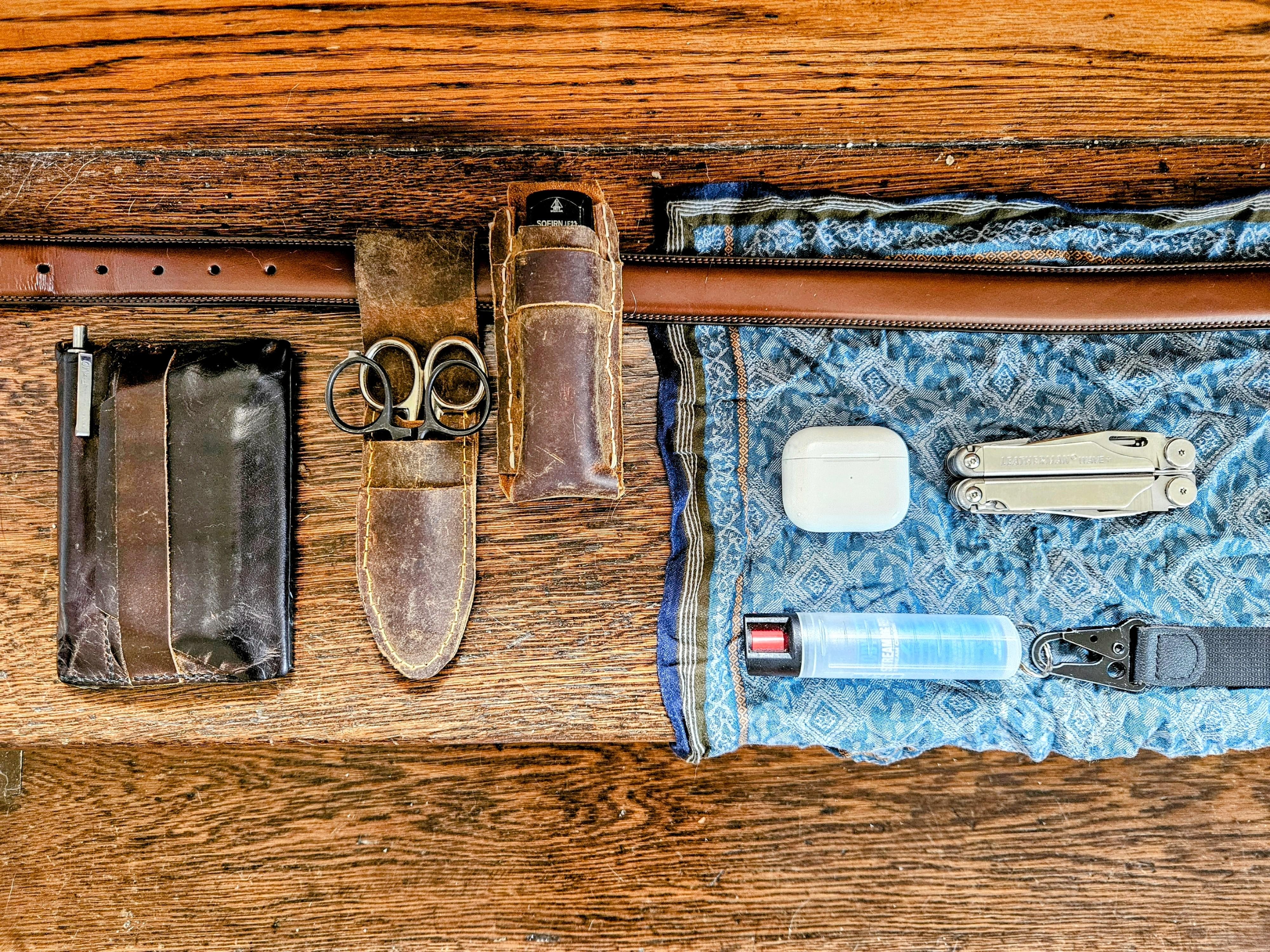 tonystark29 2 years ago # List: – Homemade leather wallet – Homemade leather scissors sheath – Klein snips – Dr. Slick Scissor-clamps – Homemade leather flashlight sheath – Sofirn IF23 – Belt – Handkerchief – Airpods – Leatherman Wave+ – Dog pepper spray