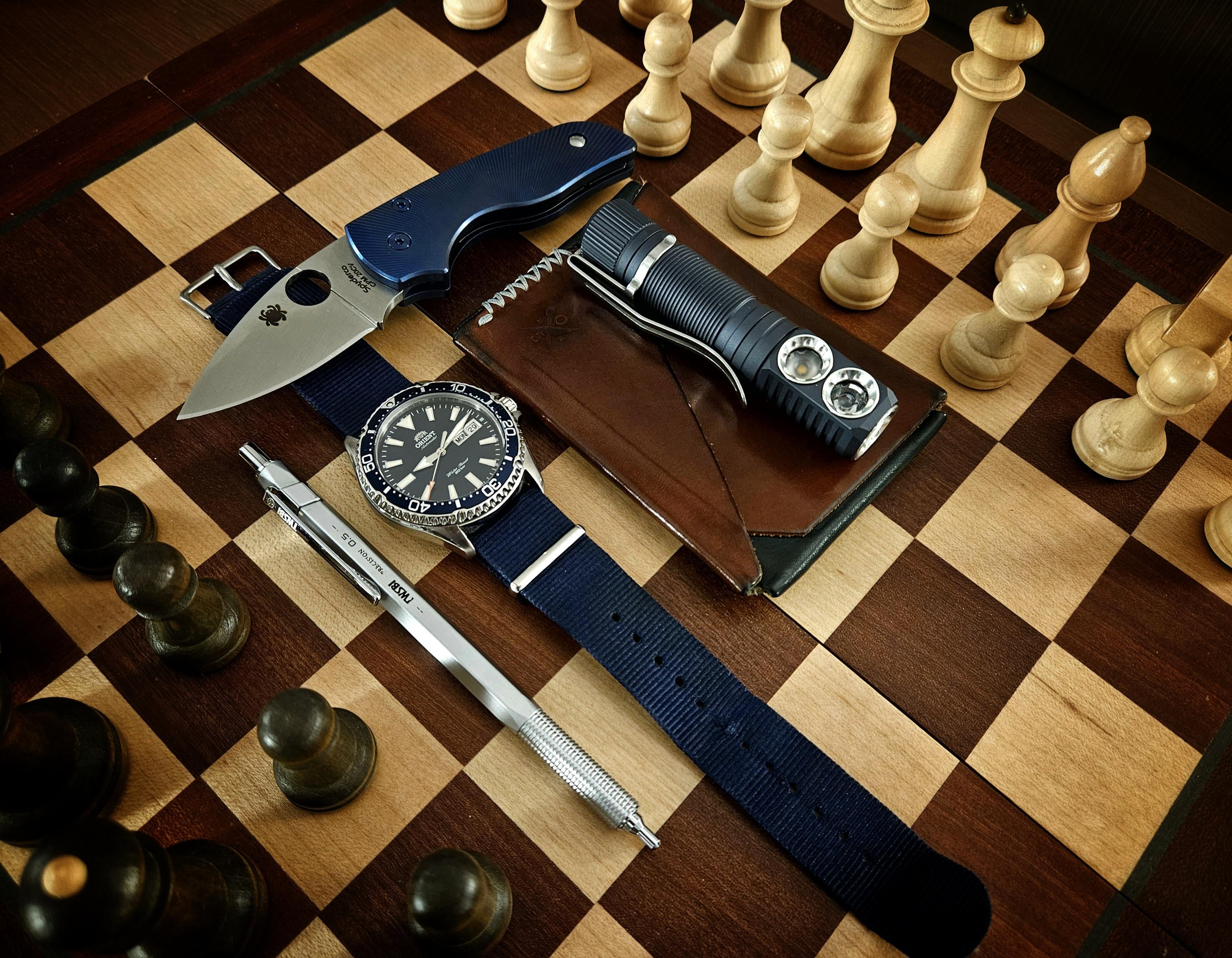 Admiral_Josh 2 years ago Wallet: Open Sea Leather, Gun Deck, Quickdraw. (Blue/Whiskey) Knaf: Spyderco Lil’ Native (20CV w/ RGT Scales). Torch: Emisar D2. (Nichia 519a[4500K] / Osram W1[6000K]). Pencil: TWSBI Precision RT – 0.5mm. Watch: Orient Kamasu.