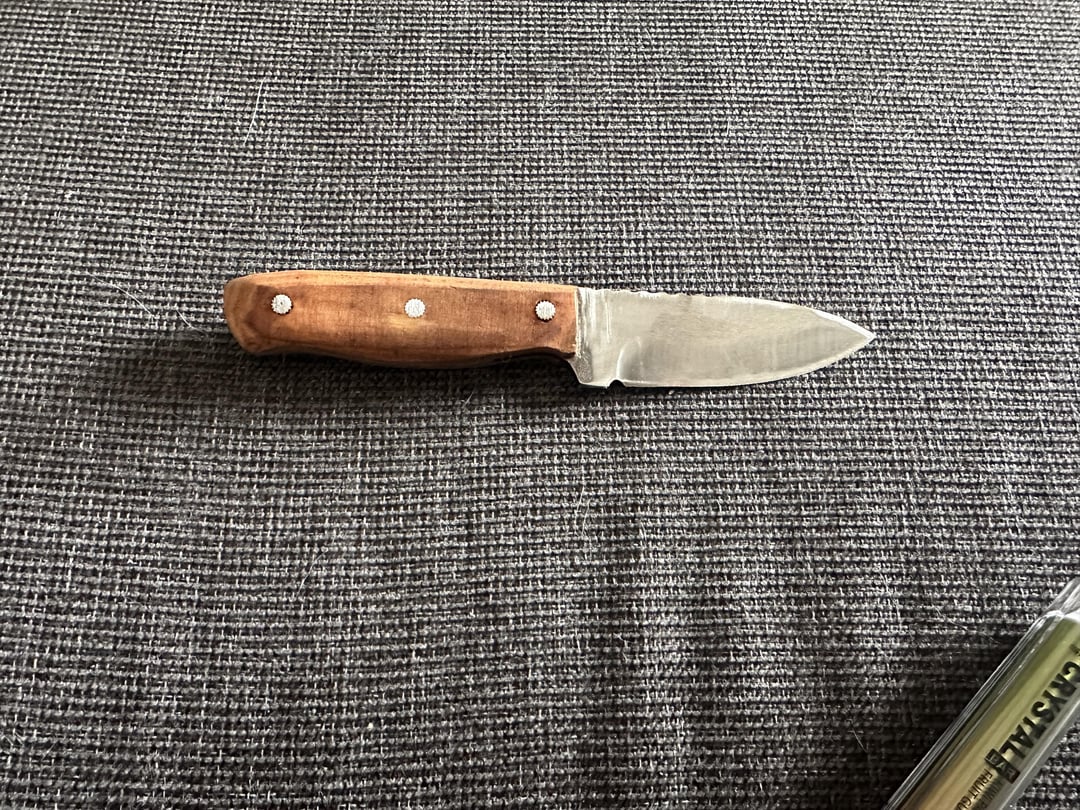 My first attempt at putting a new handle on an old blunt knife I had laying around. Pine wood handle, glued together with gorilla glue and held tight with inter screws used as the pins. Heads ground off and a bit of teak stain for the handle and I think it’s not too shabby for a first attempt. The handle feels alot smoother than it looks in photosi®