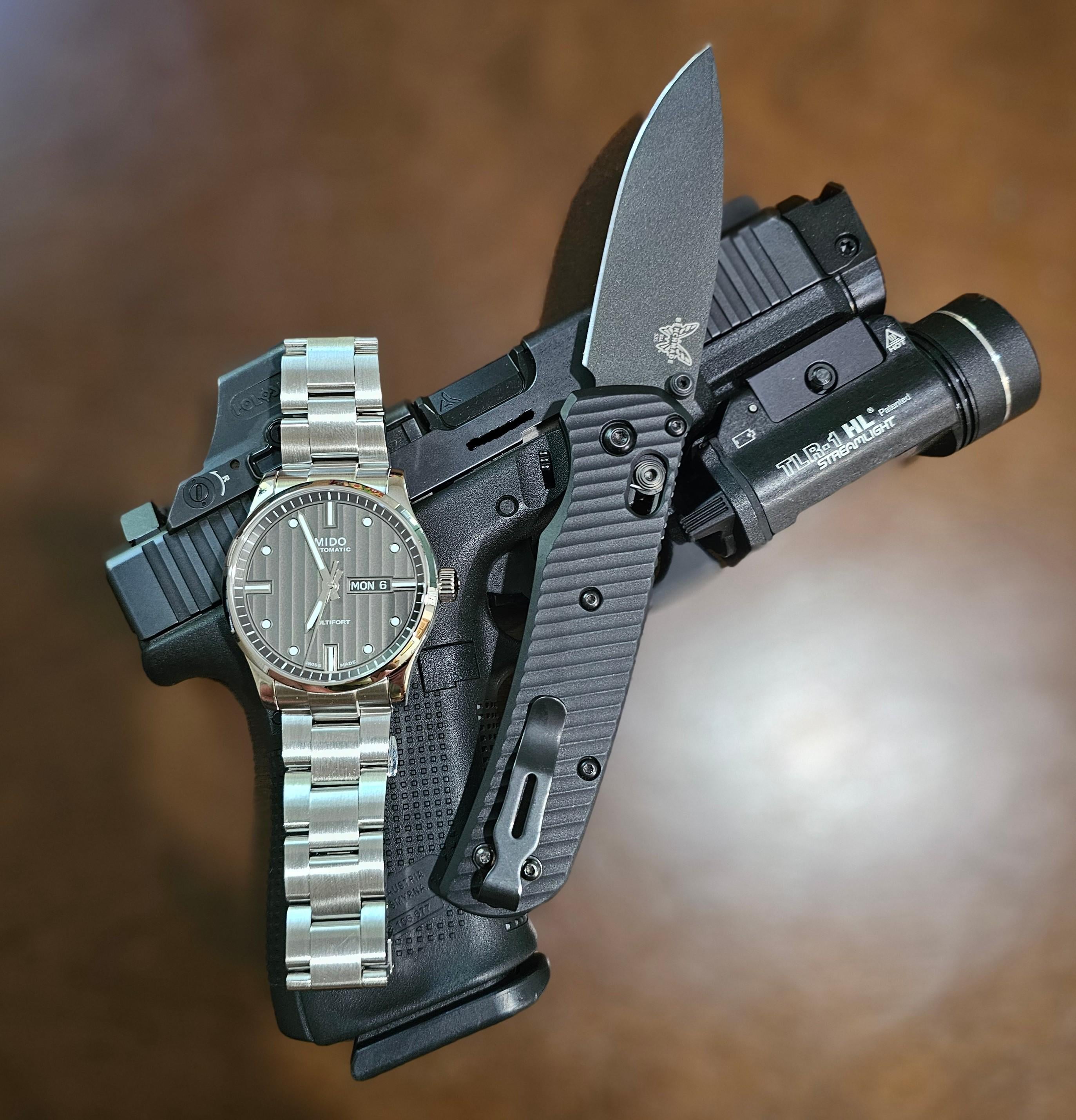 Sad_Revolution_5756 2 years ago Mido multifort automatic anthracite dial.Benchmade bugout with AWT scales.Glock 19 gen 5 radian ramjet/afterburner, holosun 508t and streamlight trl-1 hl