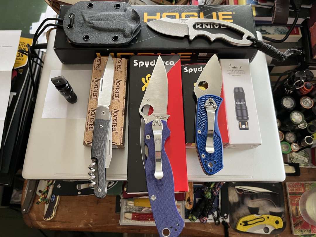In KNIVES Yesterday’s NKD mail call – I may have a problem here… May 8, 2024 Spyderco PM2 S110V; Lionsteel JK3 CF M390; Hogue EX-F03 Fixed blade 154cm; Spyderco Ambitious S35VN; Olight Mini 2 rechargeable.by iwerbs KnifeKnives Prev Post Another old knife from who knows when… a CASE XX with two blades May 8, 2024 Next Post A Good Well-Priced EDC Pen May 8, 2024 Related Posts Anyone have any idea what brand/maker this knife is? February 23, 2026 Can I buy titanium hardware for the Kizer Quoll? February 23, 2026 How to tighten this rivet? Screw? Beater Ozark Trail folder. February 23, 2026Write A CommentYou must be logged in to post a comment.