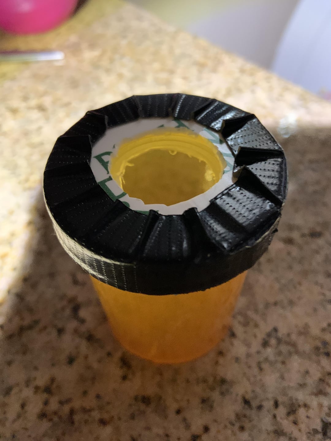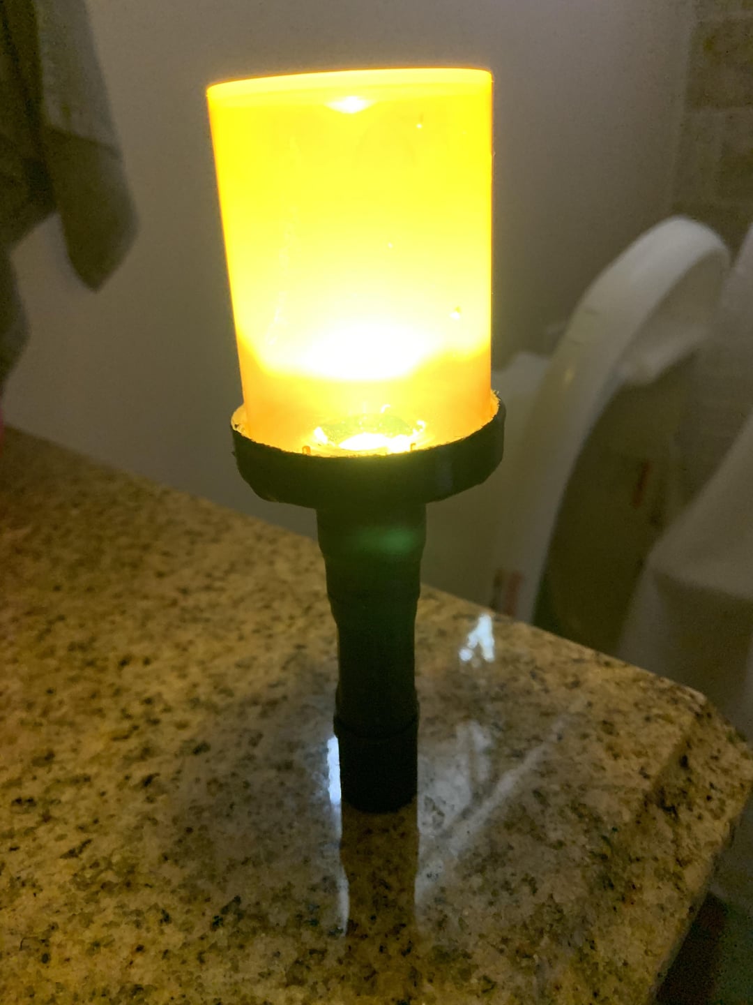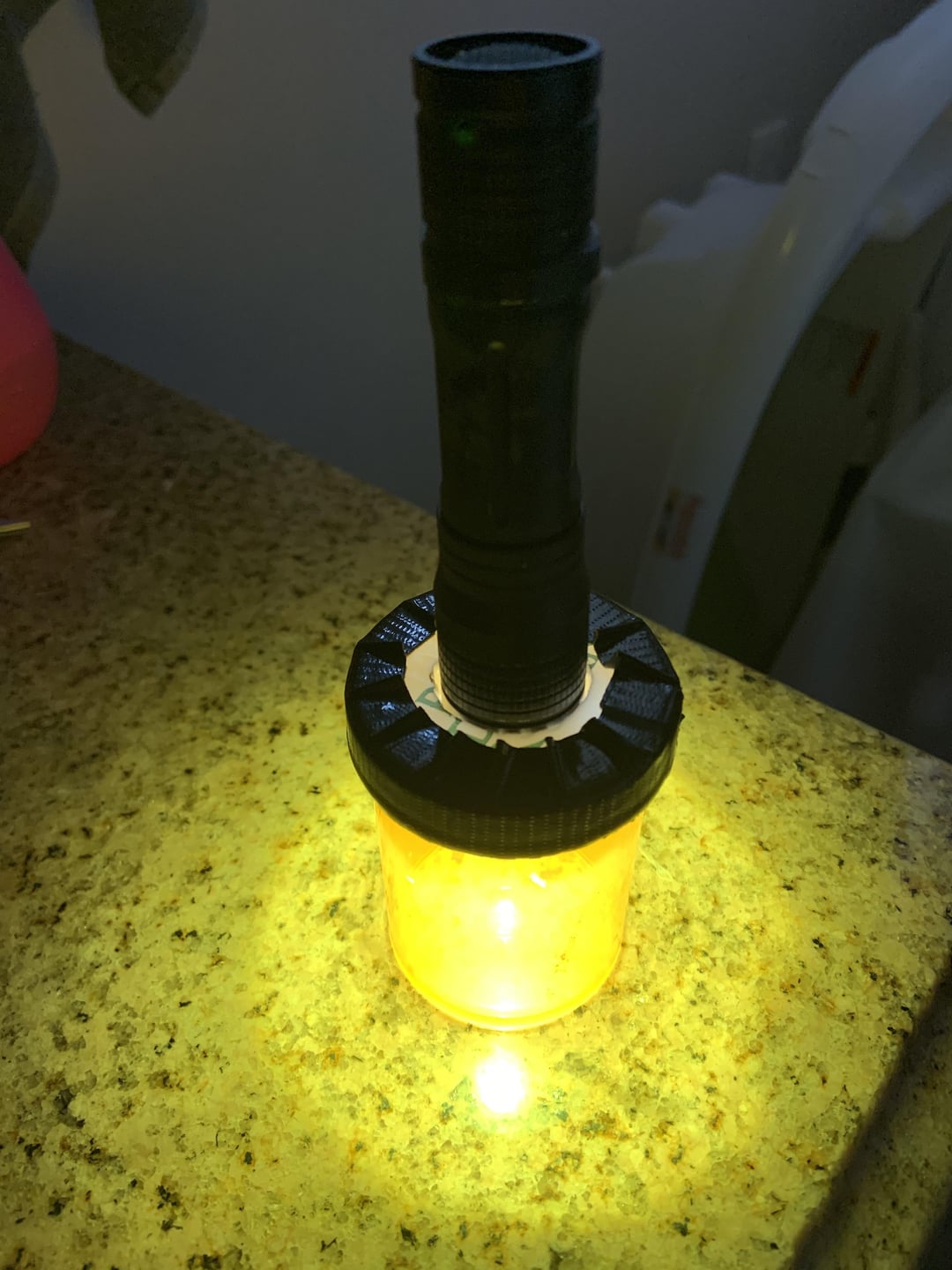 Old stubby pill bottle, a knife, and some tape. Nice amber light out of it too. Will be perfect for van camping! Running it with a cheap 100 lumen Cyclone AA light.