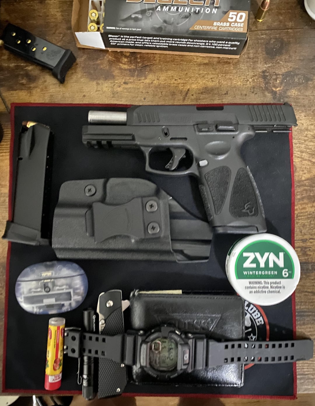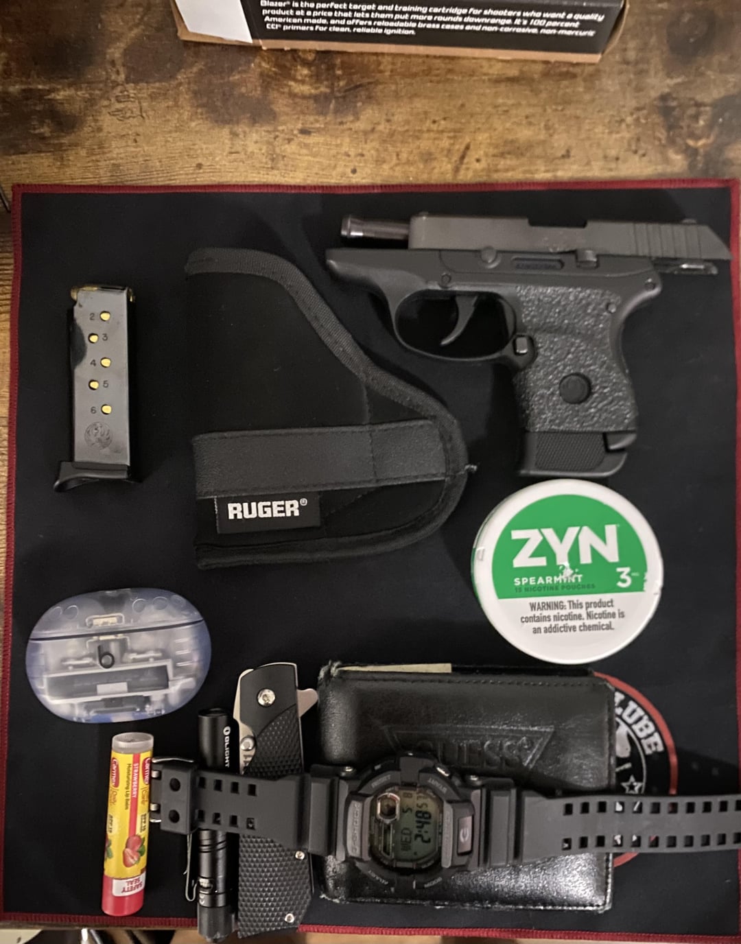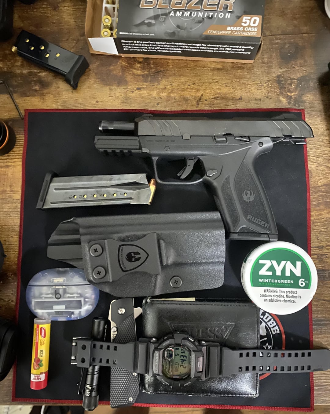 Eagle-Wide 2 years ago Guns: Taurus G3 – Ruger Security 9 – Ruger Lcp 380 Holster: Warriorland and Ruger pocket holster Knife: ColdSteel 1911 Headphones: Beats Pro Plus Watch: G-Shock Wallet: Guess from Ross 😂