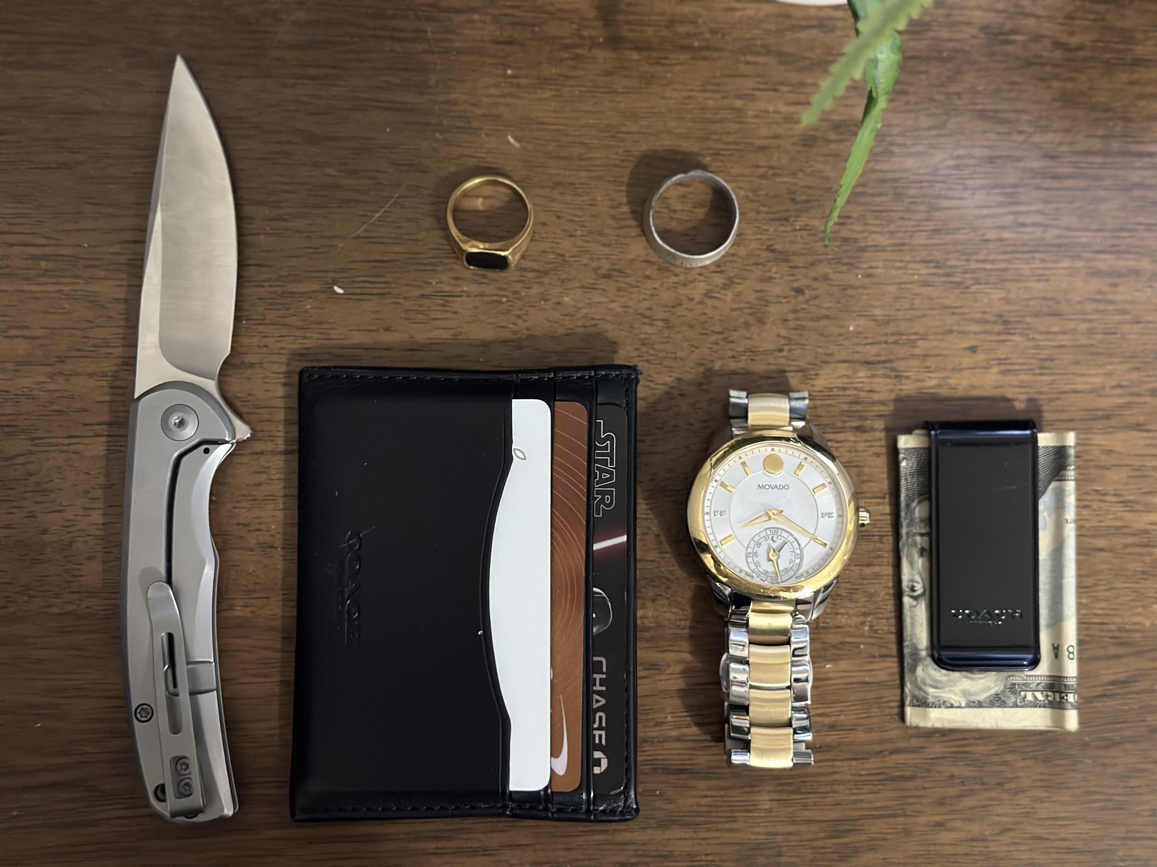 In EDC Classing things up to take my beautiful girlfriend out to celebrate both of us passing out sophomore (university) year finals May 9, 2024 Civivi NOxCoach Leather Card HolderMovado Watch (idk which model) Coach Cash Money ClipGold Signet RingSilver Quarter Ringby Ihbpfjastme EDC Prev Post Minimalist office EDC May 9, 2024 Next Post NKD! May 9, 2024 Related Posts Trusty EDC February 27, 2026 Neatly aligning items usually dumped on a desk February 27, 2026 Daily Carry February 27, 2026 1 Comment BitNew7370 2 years ago My chase visa bows down in awe of yours.Write A CommentYou must be logged in to post a comment.