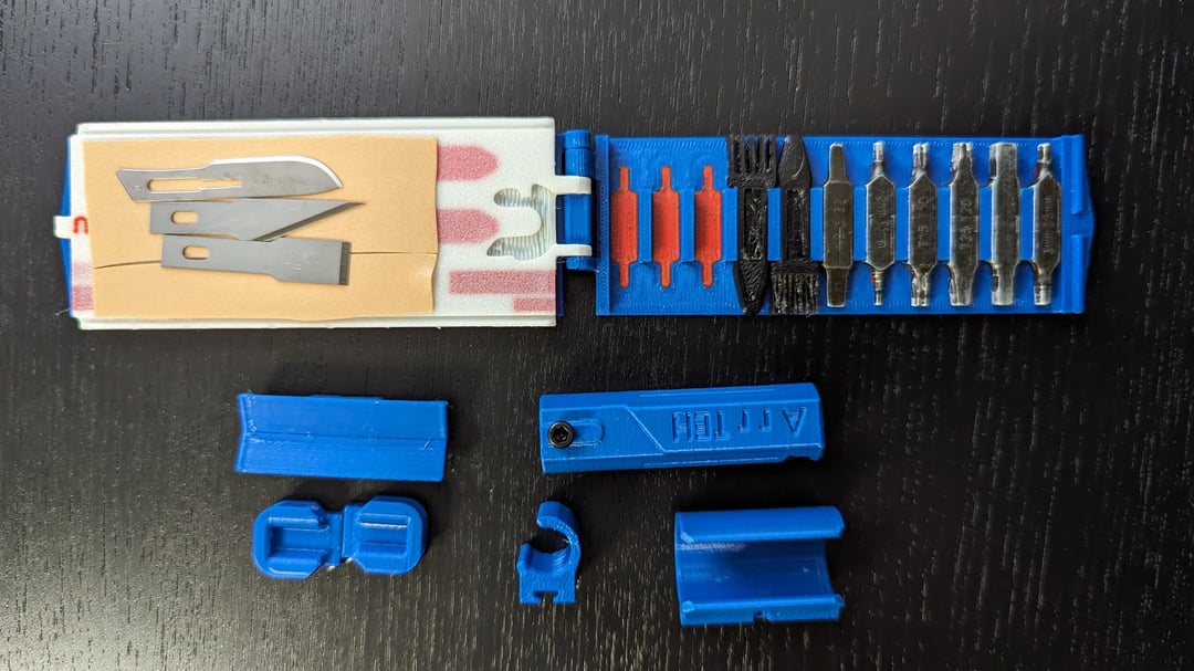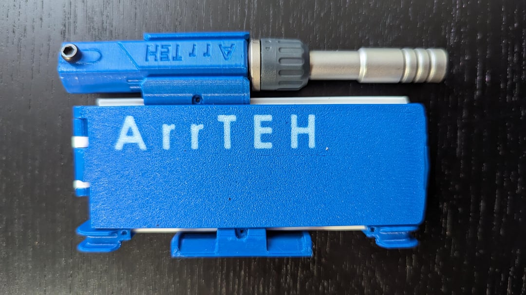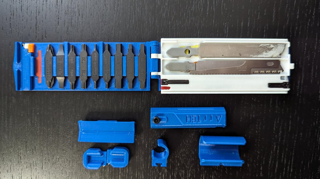 The companion has rails on it’s sides, on which you can slide on and fix a plethora of little clamps or fixtures. These can hold the mentioned multihandle, the ratchet or bit extender, flash lights, wire, rubber bands, spray flasks, whatever you deem necessary. Completely customizable.
