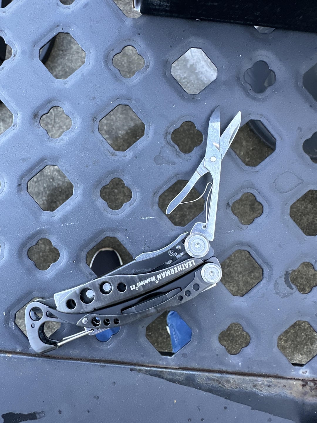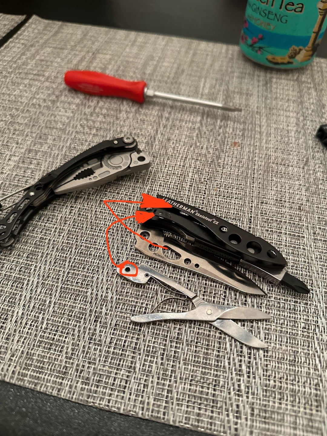 Just take the leatherman apart, measure the hole and start drilling out the scissor, making it the same size as the knife. I drilled and took a little more metal out towards the scissor part giving a little more metal material for the liner lock to hit the scissor and somewhat “lock”. Put it back together then the finished product is what looks and feels like an actual finished leatherman multitool with a great pair of scissors.