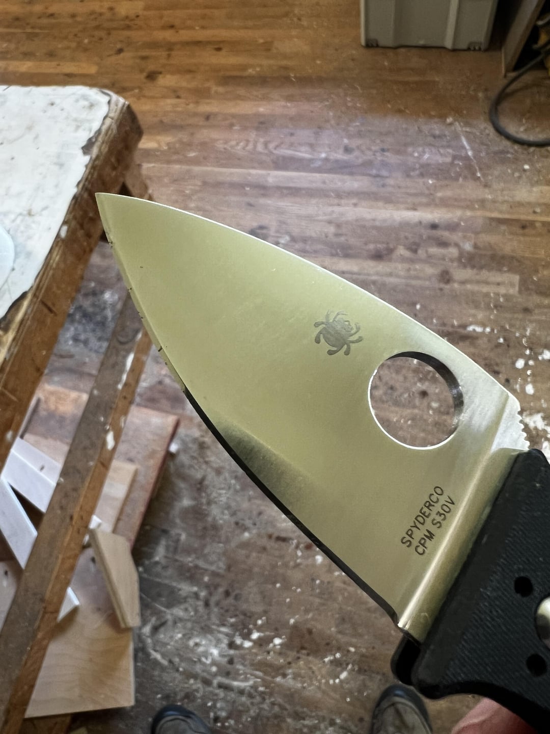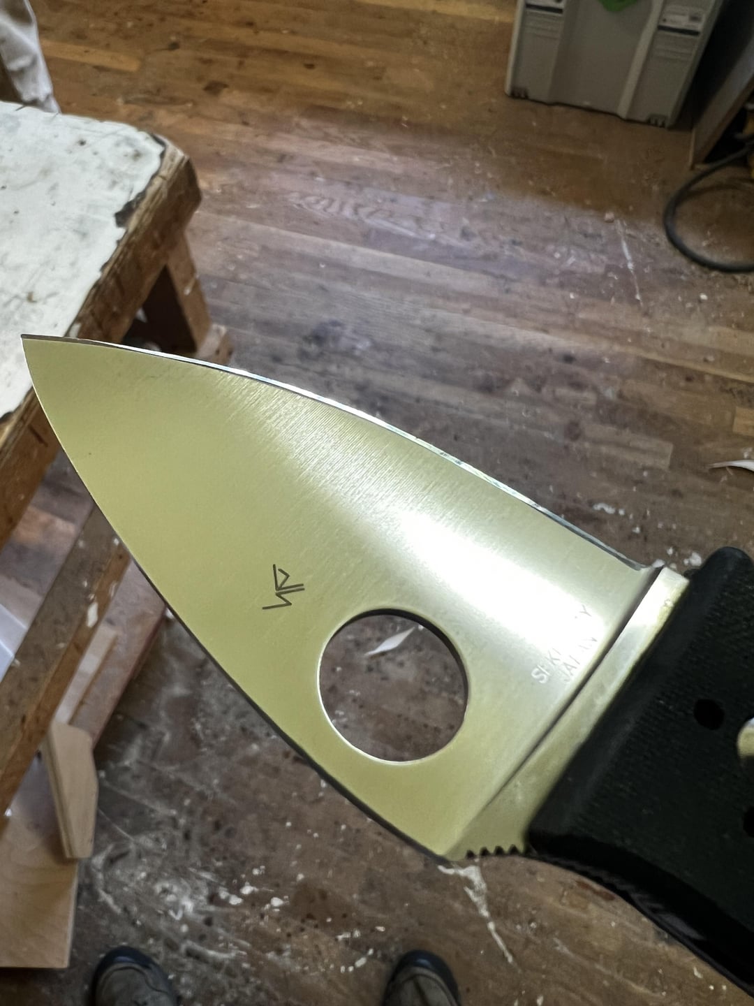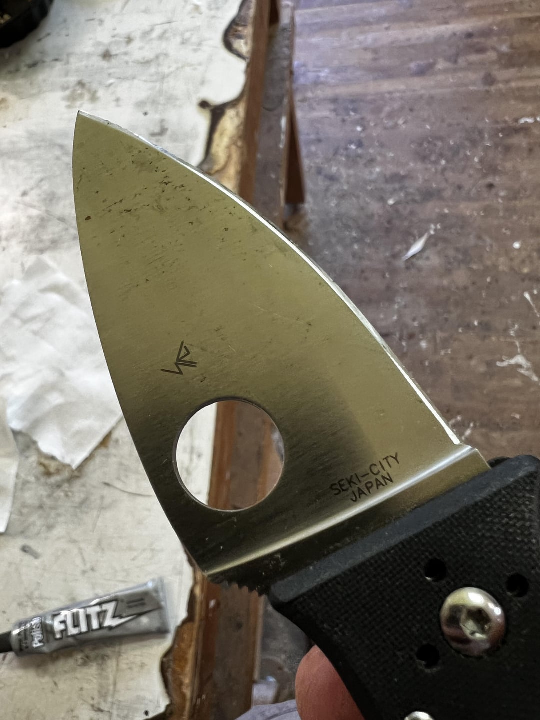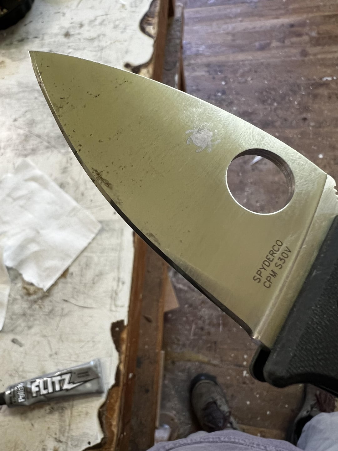 Today I received this used Spyderco Lil Temperance 3 from someone on r/Knife_Swap . The blade had tape residue and rust spots on it when it arrived. I cleaned off the residue with acetone in no time, then I took some pictures to clearly show the rust spots. Using Flitz polish I was able to remove the surface rust by hand in about two minutes. Since it is a non abrasive polish you donβt need to worry about scratch patterns when using it. It is a fantastic product that I feel like everyone should know about, and can be found at most auto parts stores.