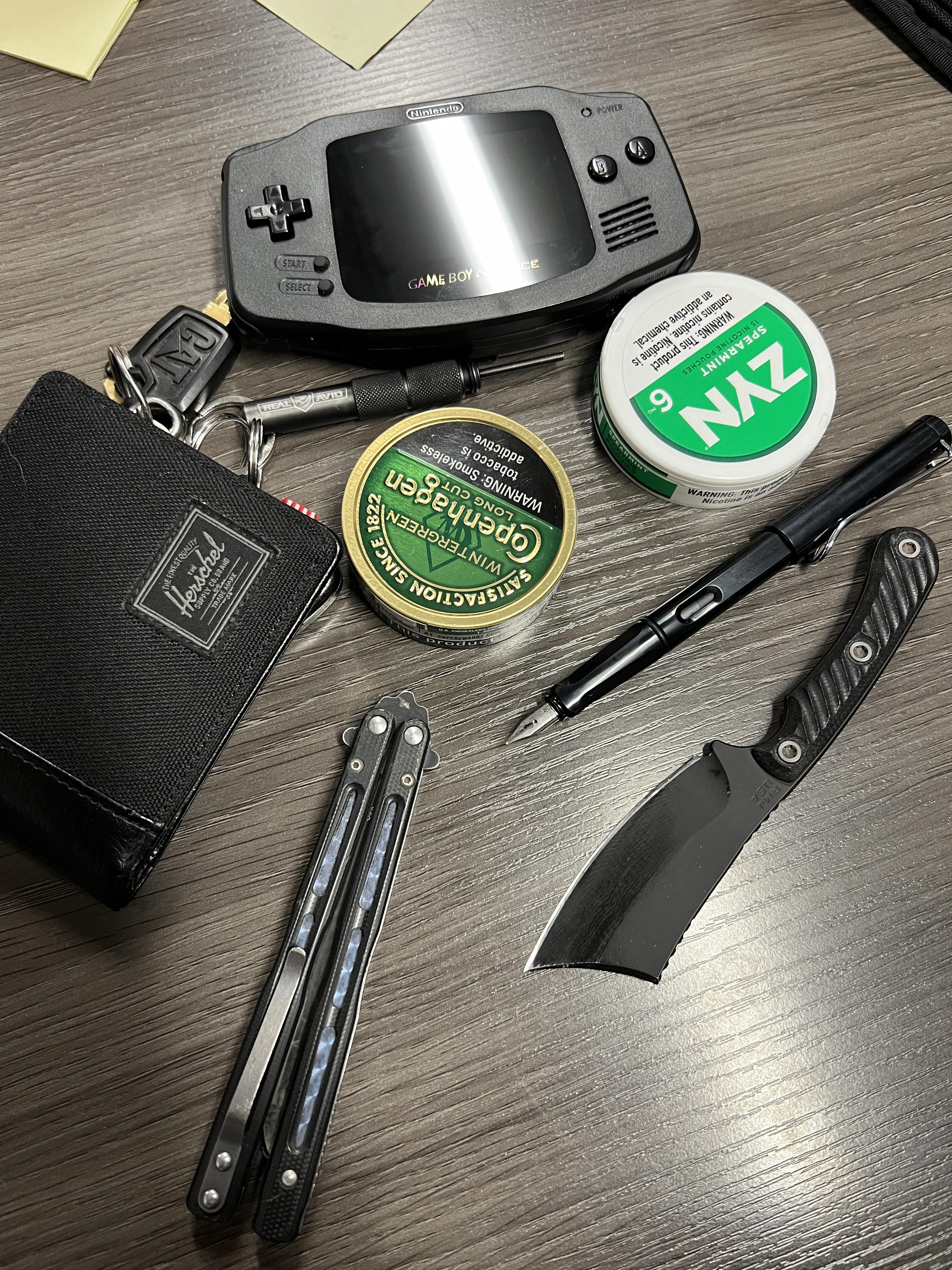 In EDC dumped June 5, 2024 – tobacco and tobacco accessories – work and personal keys w/ glock tool – herschel wallet – benchmade 51 fidget toy – rmj tactical jackdaw – lamy fountain pen – gameboy advance modded w/ worms world partyby musclehamster59 EDC Prev Post Anyone else carry a large flashlight in their pocket? June 5, 2024 Next Post Something different: Remette Swordfish gravity knife June 5, 2024 Related Posts Current edc January 16, 2026 edc 🫡 January 16, 2026 18 yo Detailer EDC January 16, 2026Write A CommentYou must be logged in to post a comment.