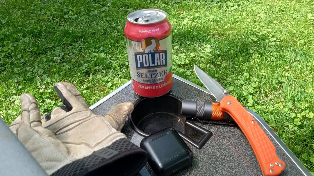 Cheap leather work gloves, Polar sparkling water, Tozo Earbuds, Buck 112 slim select, and convoy s2+ sft40 6500k (bright enough for daytime)