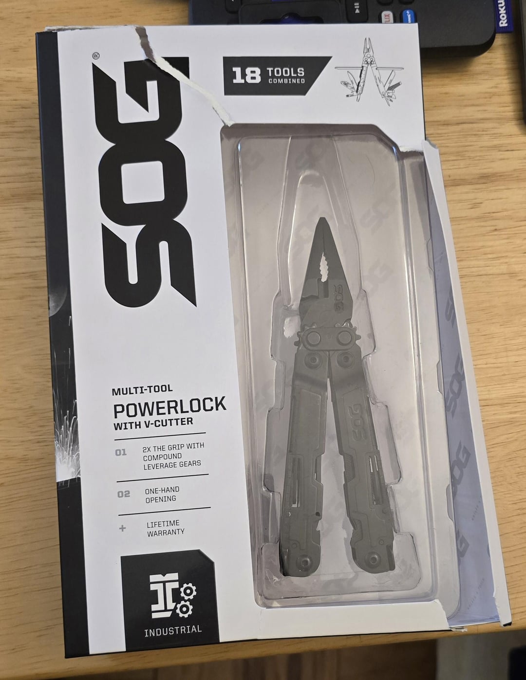 Wild guess here, but I’m gonna venture it’s a SOG Powerlock, but only due to it being massively printed right there on the box. Could be wrong though.