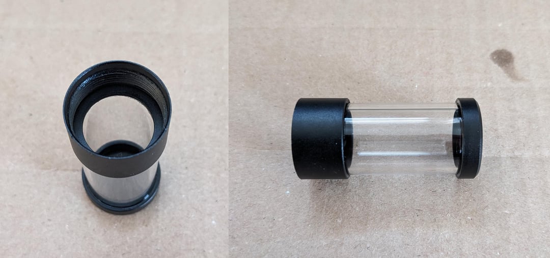 The custom housing is made by cutting a tube of 20 mm borosilicate glass to length and gluing it to the aluminum parts using low viscosity UV glue.