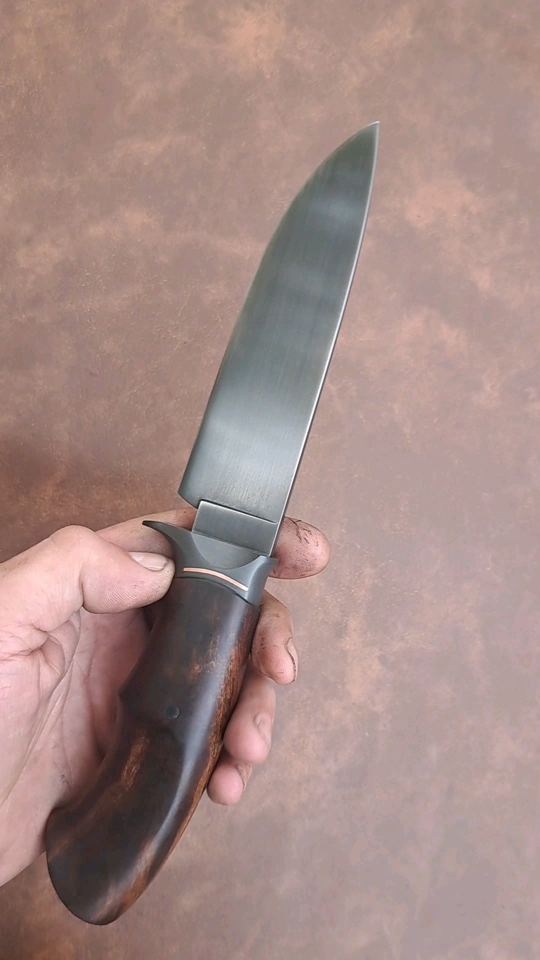Guard made of 1020 steel with copper inlay and a phosphatized finish. Handle made of natural ‘Imbuia’ wood with a fiber pin.