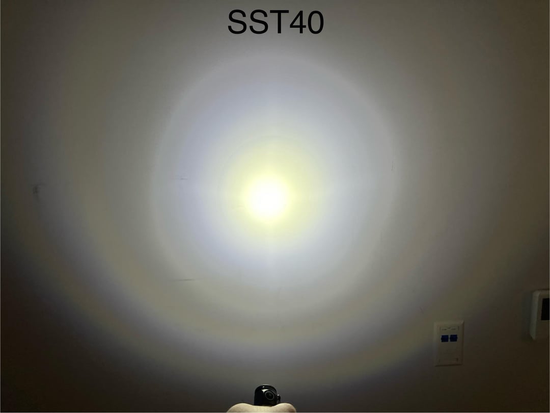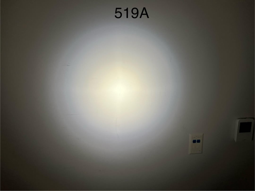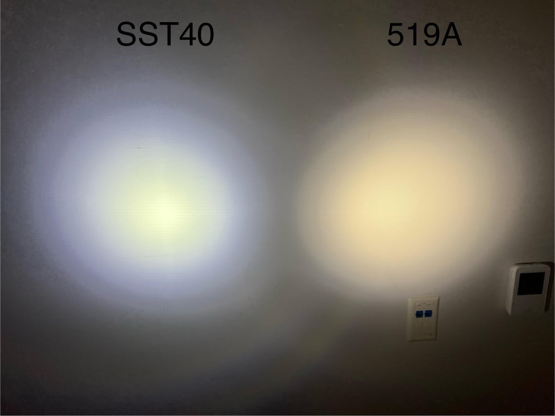 The 519A feels significantly less throwy, but I think that’s just an artifact of the higher intensity SST40. The 519A has a nice even hotspot that is more usable, way less ring artifacts ,and waaaayyy less tint shift across the beam. All shots are on turbo, ref->519A->SST40.