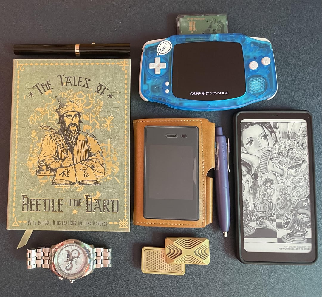 Middle – walkman a55 / journal + no nonsense fountain pen, wallet, light phone II, uniball one, boox palm (ereader)