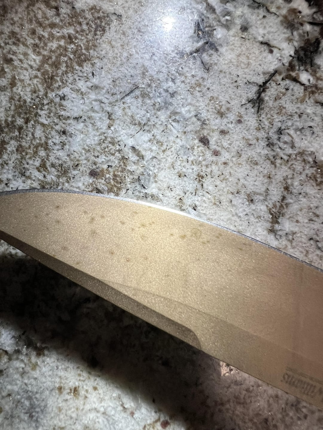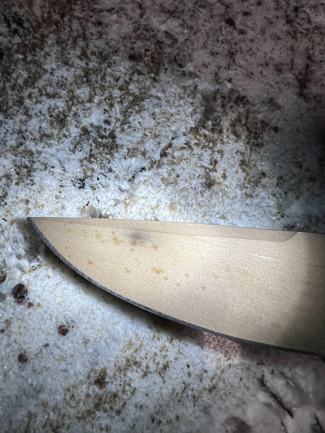 These spots started showing up on my knife about 2 days ago and Iβve tried scrubbing them off and nothing, this is my first nice knife so far so whenever I use it for something nasty I clean it with water but always make sure itβs dry and I live in the desert so humidity shouldnβt be a problem. Itβs on both sides of the knife and the spots are only near the tip of the blade