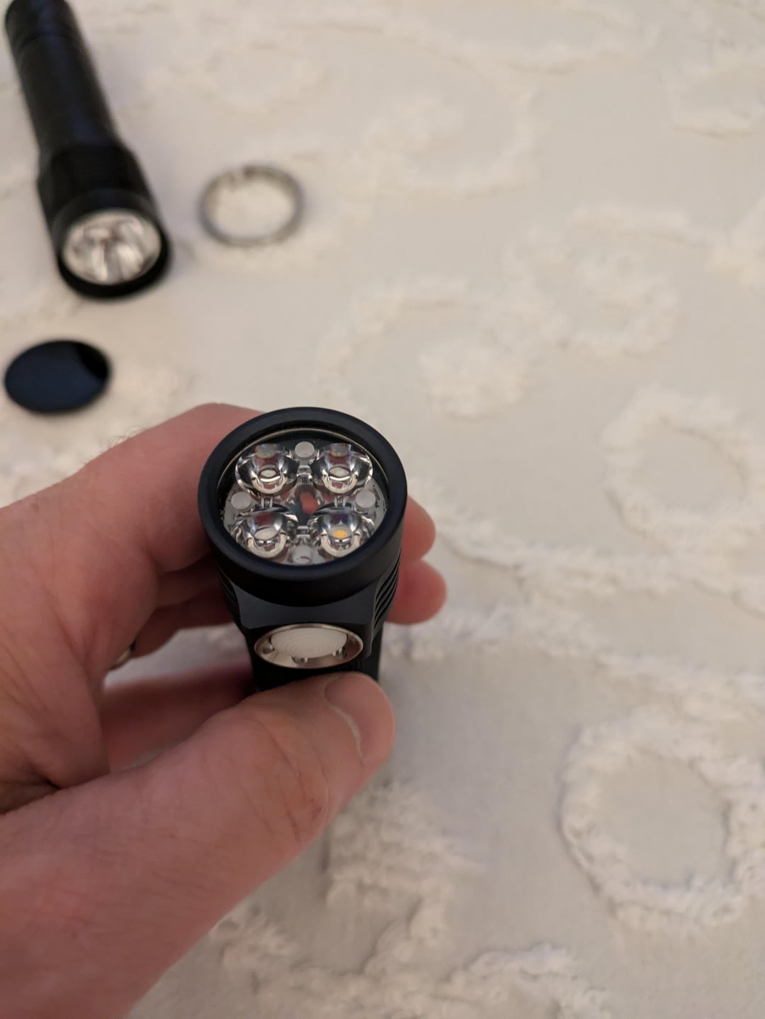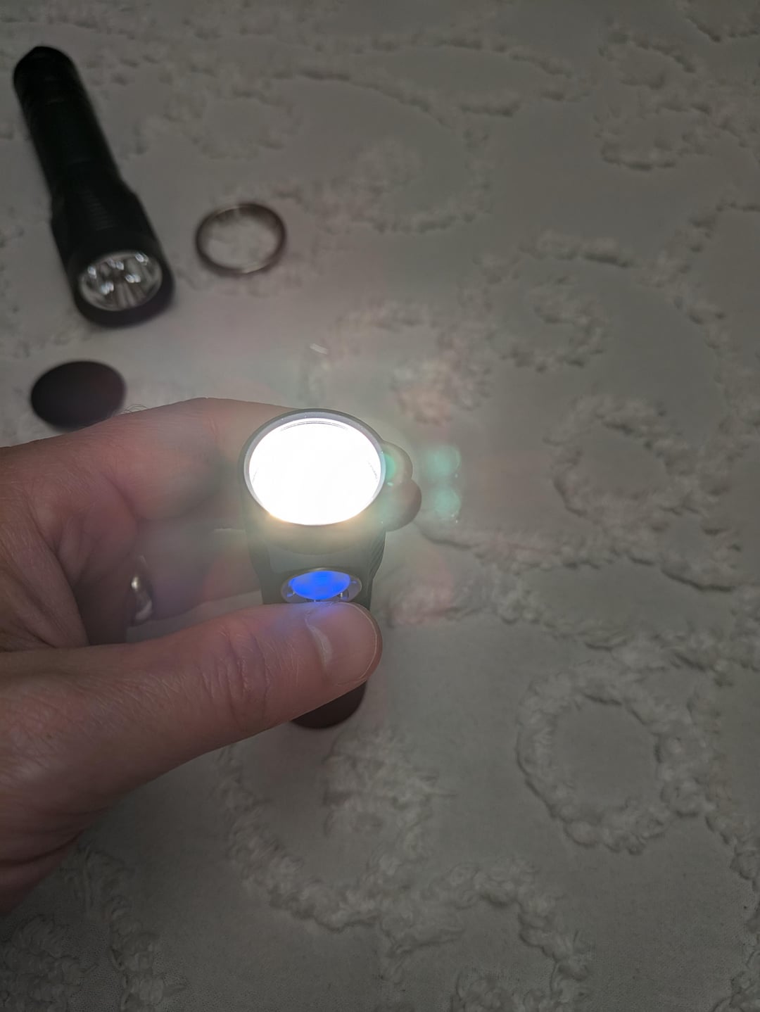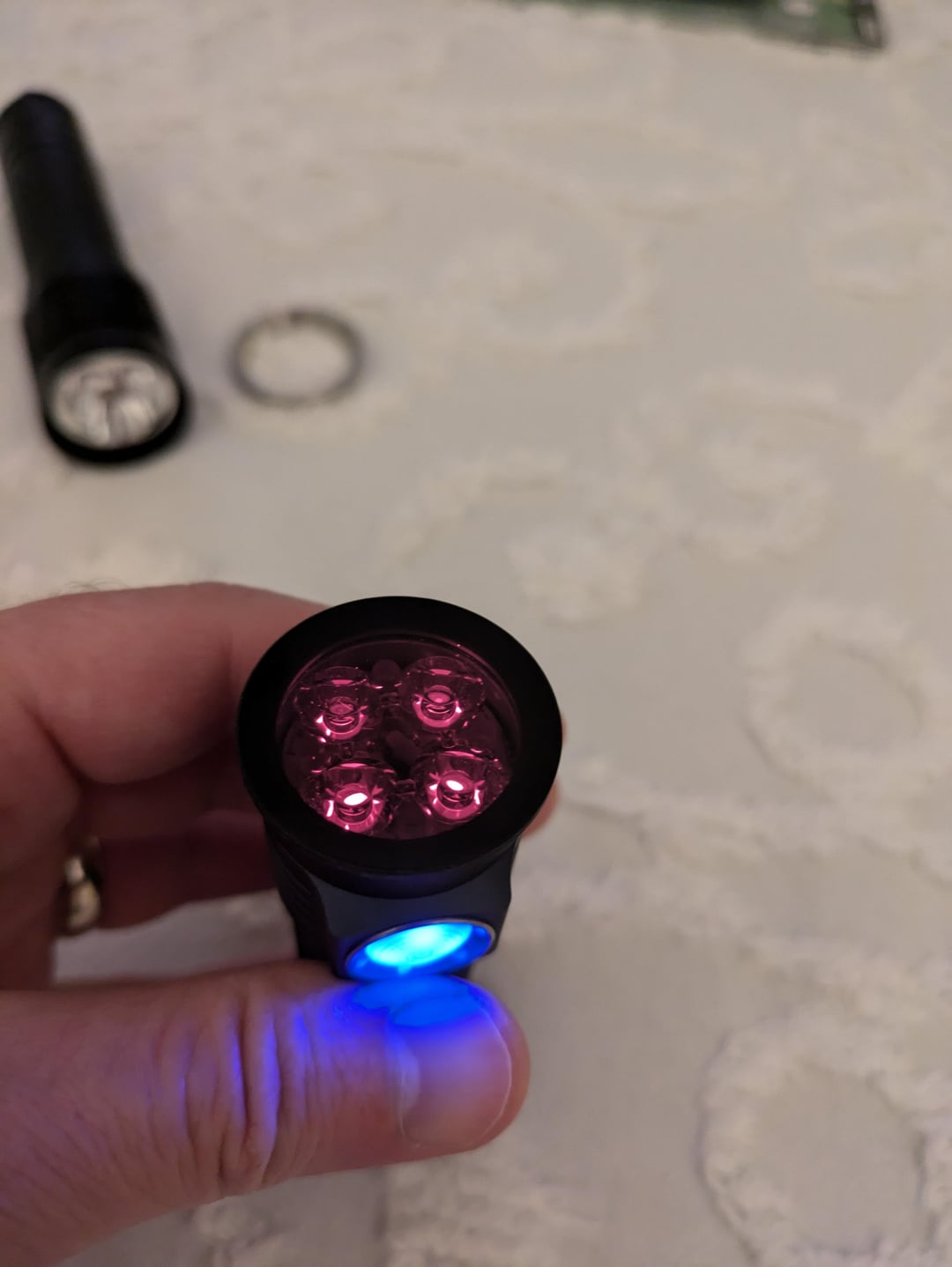 u/Thunderbolt294 mentioned wondering what a normal LED would look like with a ZWB2 filter in front of it. So I took the filter off of my S12 and put it on front of my D4k, which has dedomed 5700K 519a emitters. The pictures look more pink, but the red is a deep red in person. Are we seeing the opposite end of the spectrum here? I know the filter is supposed to block all visible light right?