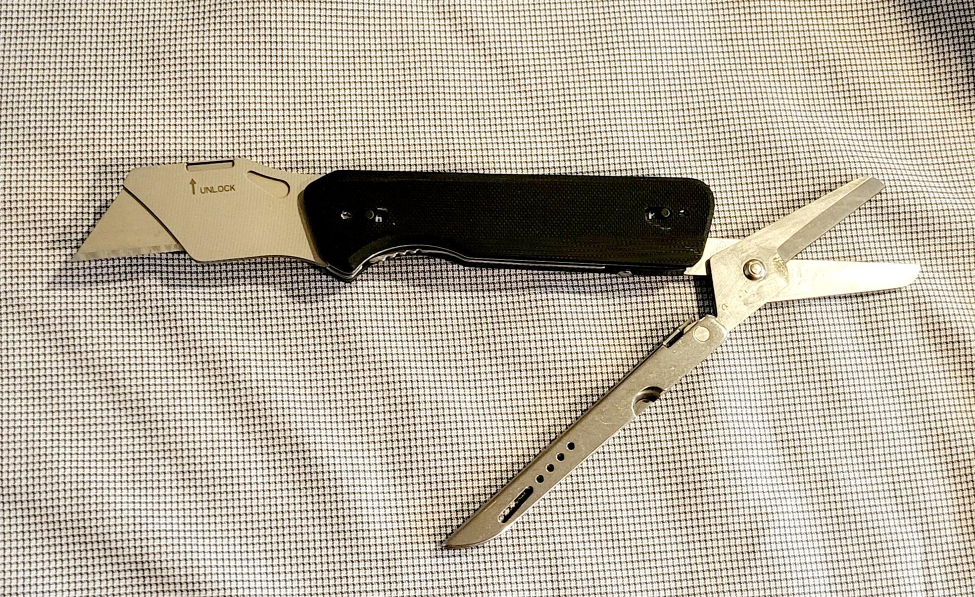 It’s 4.4″ closed and weighs 4.6 ounces. I have two. I keep one in my kitchen for package opening and various scissor tasks, and one in my toolkit. The utility blade opens one-handed. The S501U uses a liner lock. Mine sits at a perfect 50% engagement.