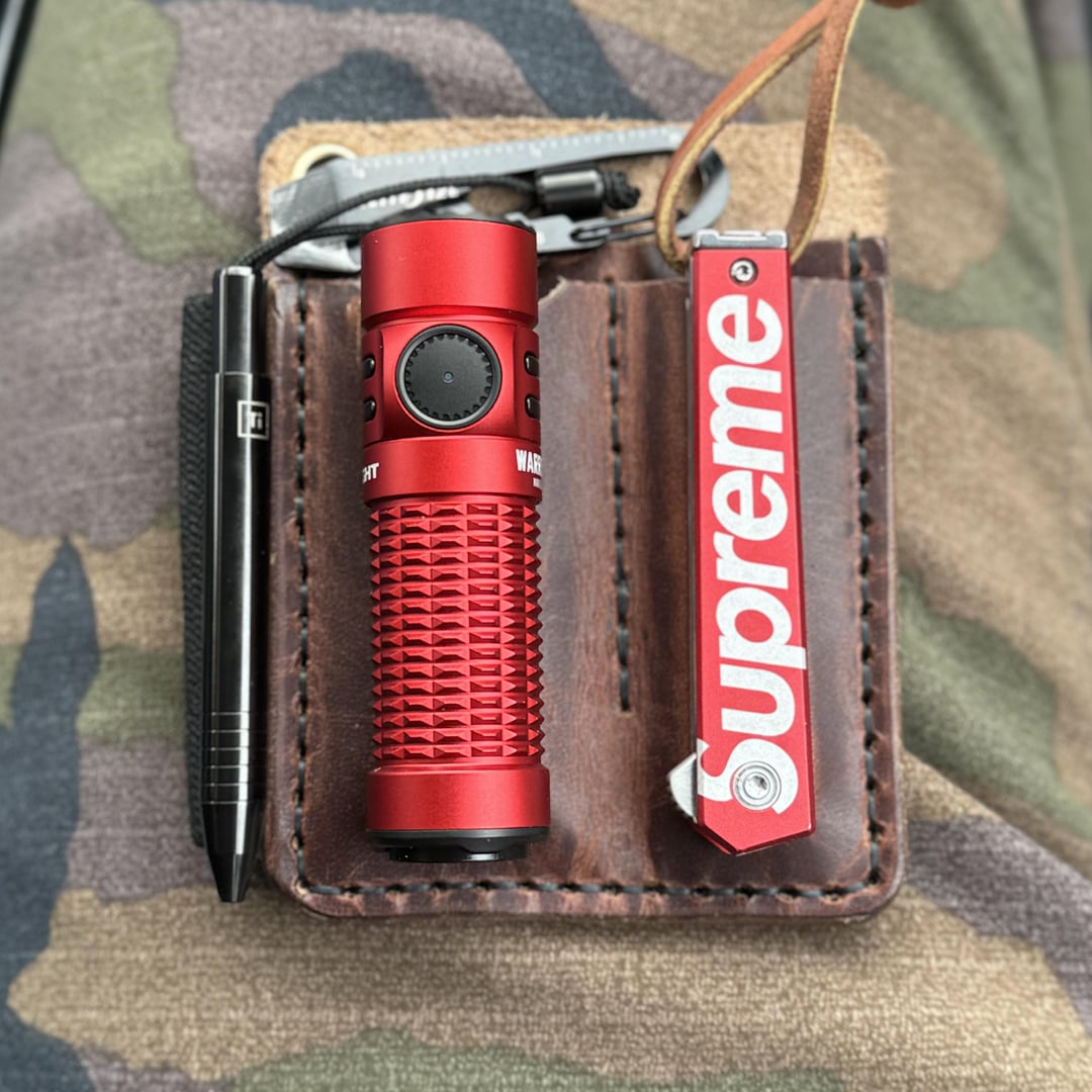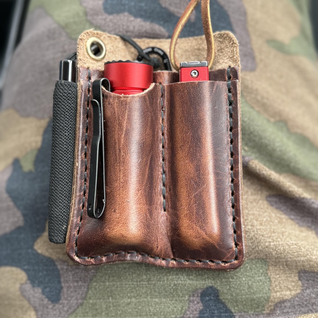 CRKT micro flipper knife. Olight warrior nano flashlight. Big Idea Design Mini pen. Nite Ize mini tool. Wayfarer Pro pouch by HammerThreads