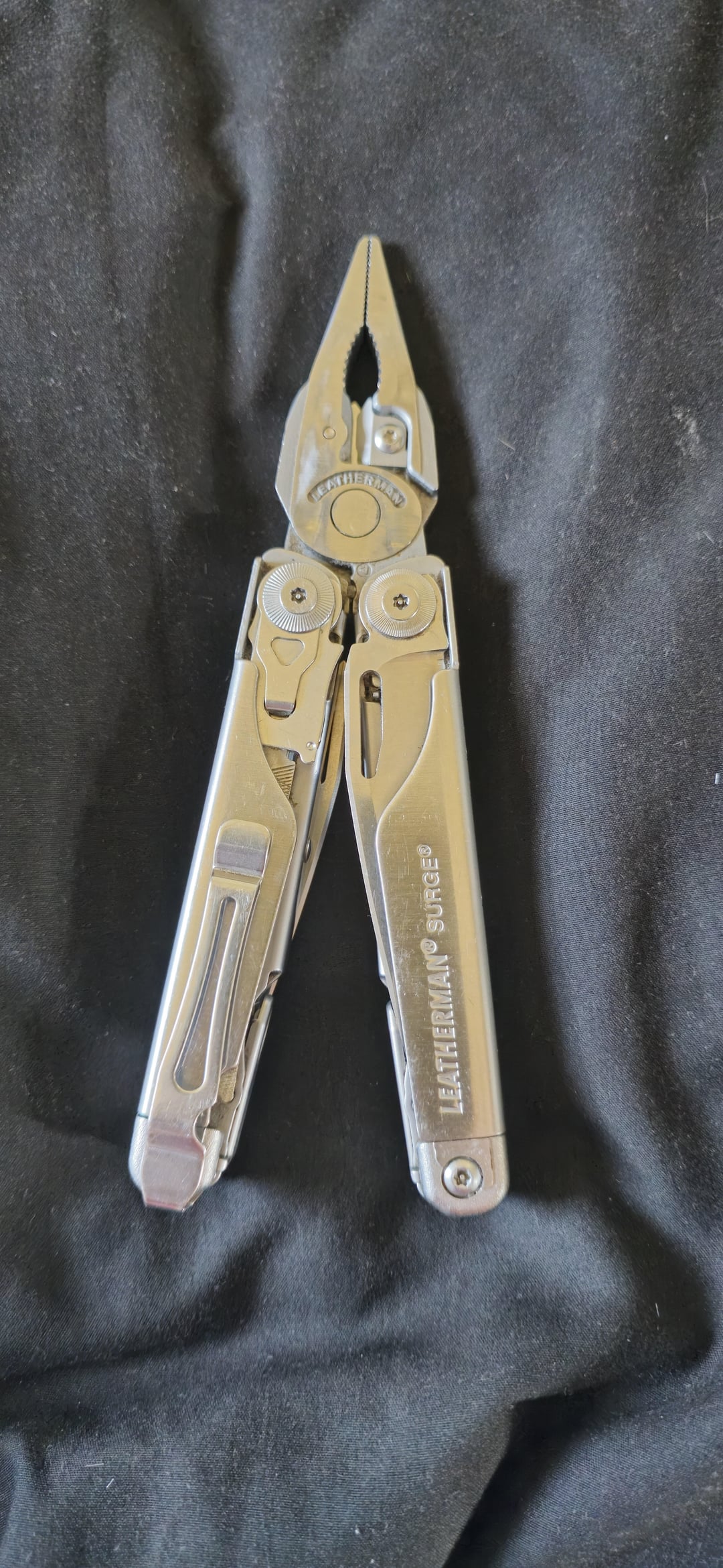 I have two Leatherman Surge multitools. Instead of sending the one in for warranty, that has the small flathead screwdriver broken off, I just kept it for spare parts. Yesterday I got a bright idea. Being that the main blade was still good, I swapped it over on the one I carry, into the place where the serrated blade was. For those that wonder, how often I’ve used the serrated blade in the roughly 5 years I’ve carried a Leatherman Surge. ZERO! So why waste that real-estate with something that is useless to me, and replace it with something that I actually have use for. Also had the extra pocket clip, so I decided why not? That way I don’t have to fumble around with it to make sure the clip is facing the right way.