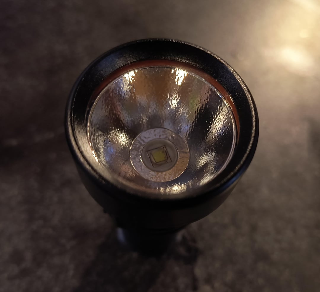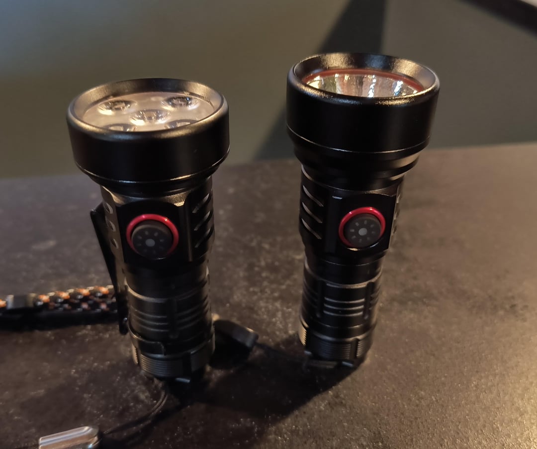 Some of you may be familiar with the “WG819 EDC” flashlight that was sold by Sofirn. There is what appears to be a new version, and I was sent one for review. The WG819 is a quad emitter 18350 flashlight with a TIR lens. It’s quite floody and produces around 2,000 lumens. This new model is a single emitter version with an OP reflector, and more on the throwy side. It also takes an 18350 even though it came with a 16340 instead. Otherwise they both look very similar, with the same knurling, red accents, backlit switch, knurling, etc.