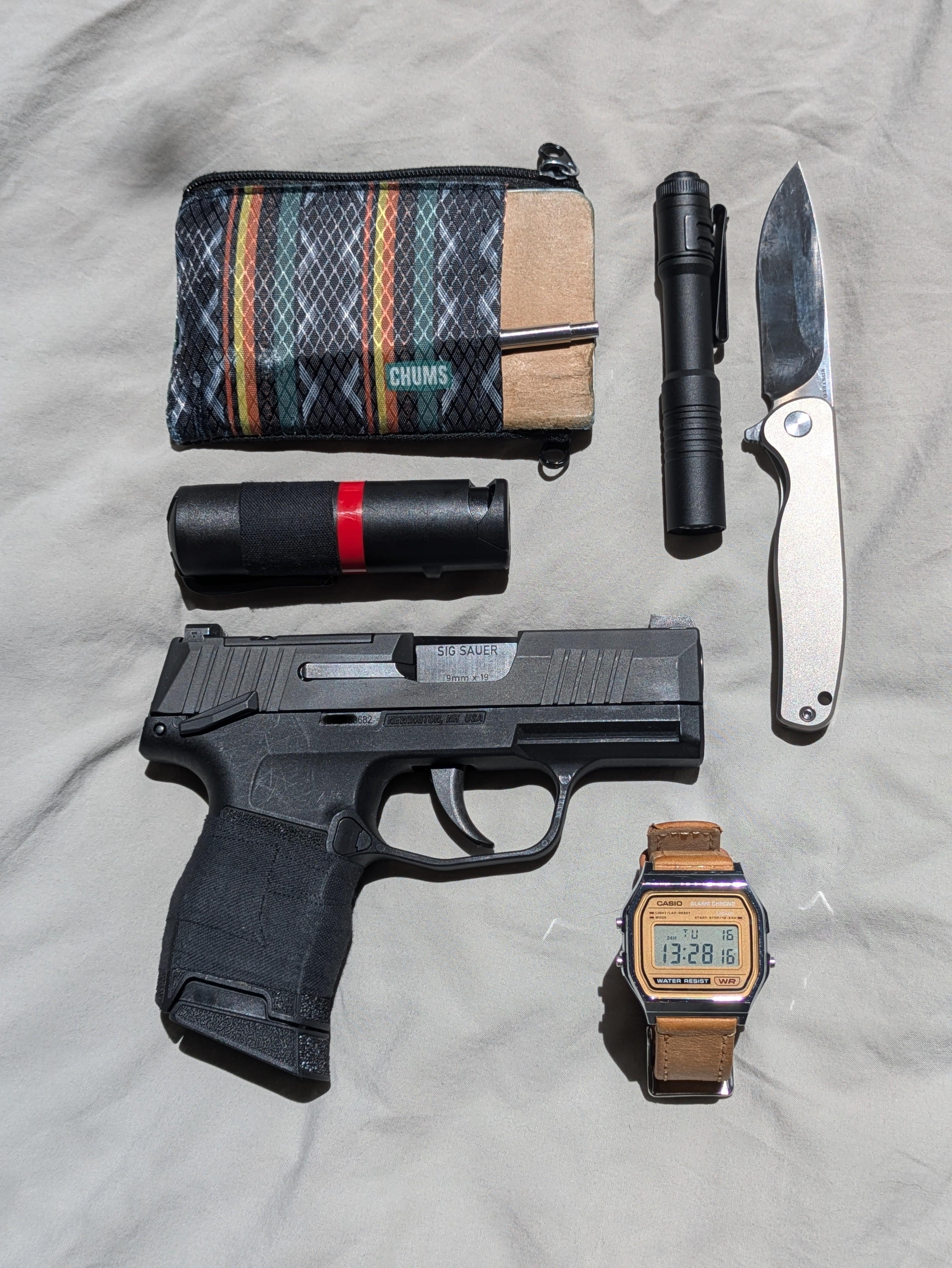 * Chums wallet with notebook and zebra T3(Pen) * Streamlight Microstream USB * Vosteed Mini Labrador * POM OC * Sig P365 * Casio watch