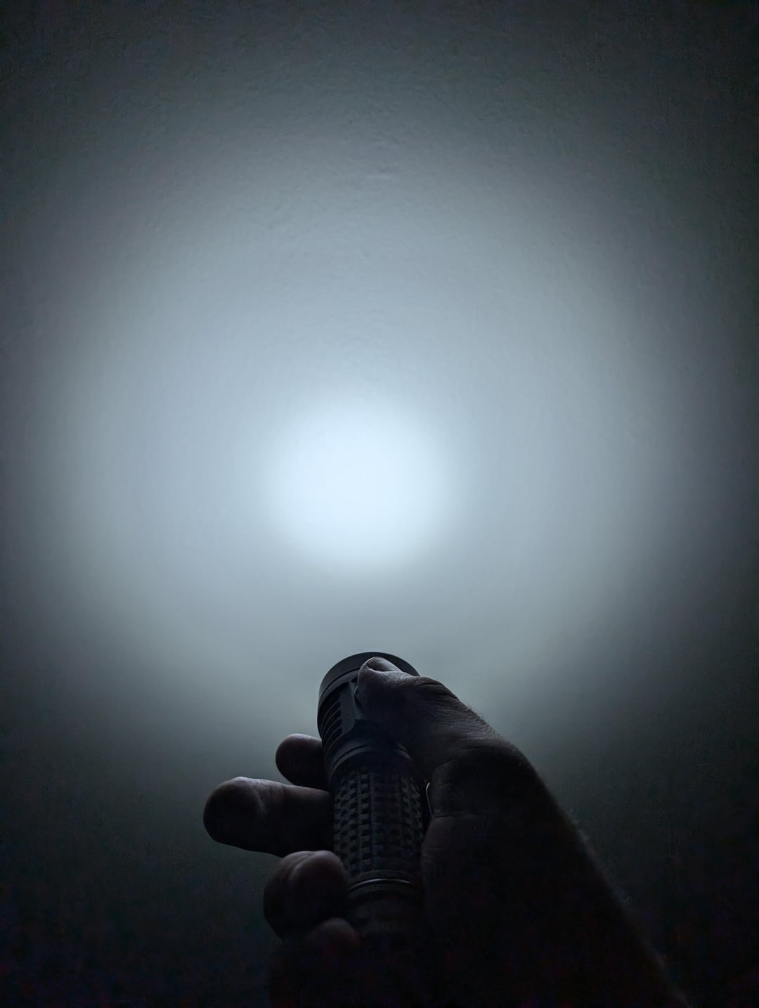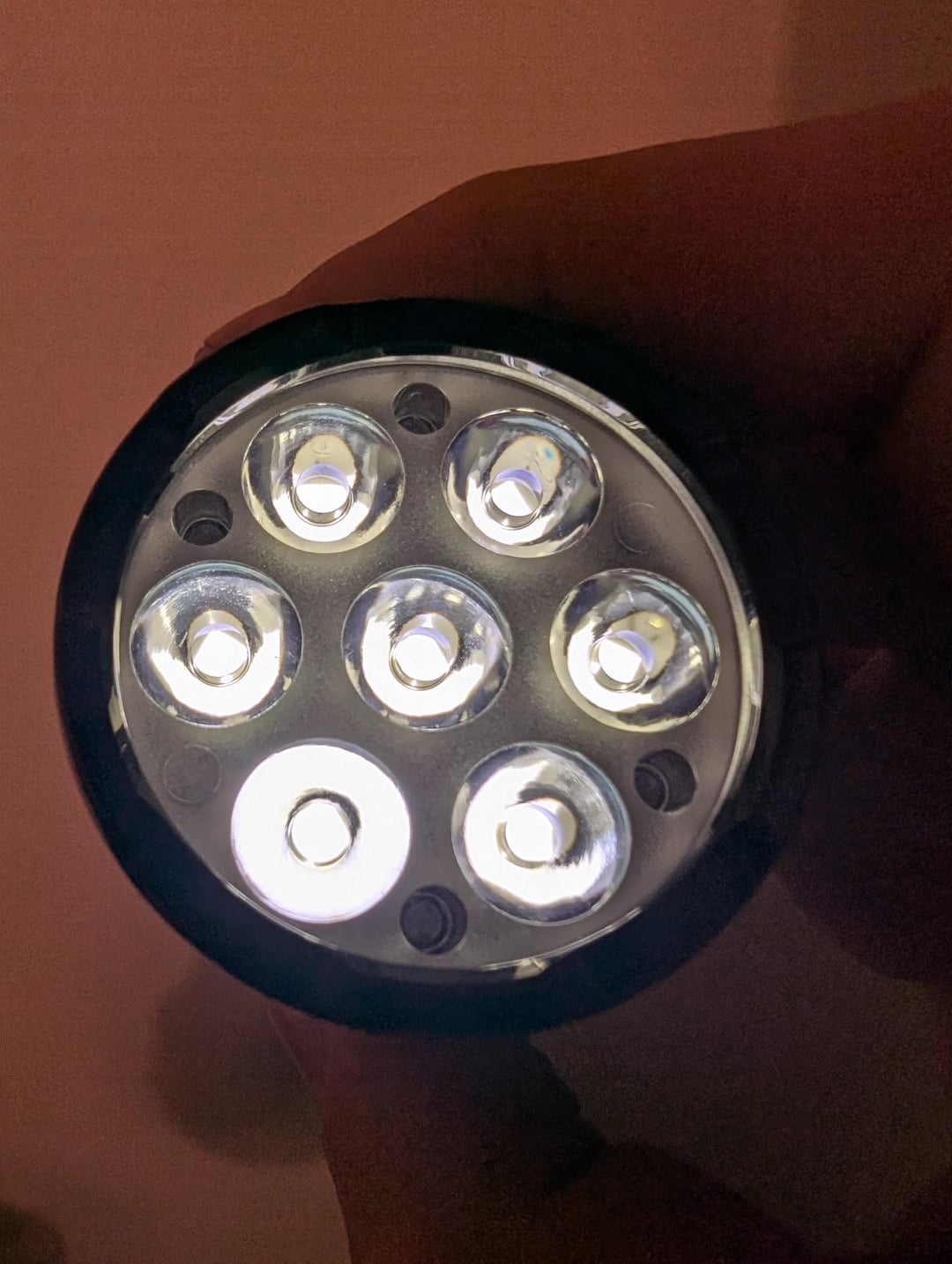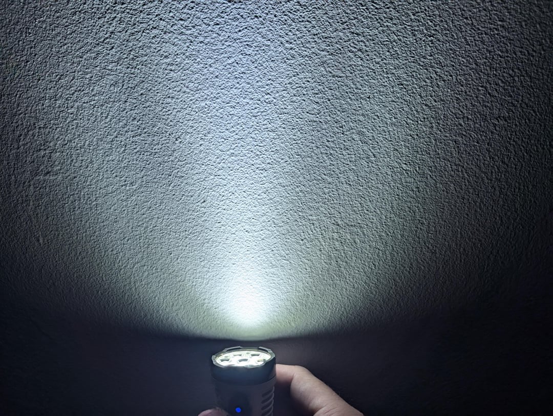 No way of measuring lumens, but seemed similarish to a Mateminco MT04 with 4x XHP50s running off a Molicel P45B… But tint Also way better on these sliced XHP50.3 HDs. Also seems like more lumens than the SFT40 version of this E07X mod, but less throw – though the hotspot is twice as wide.