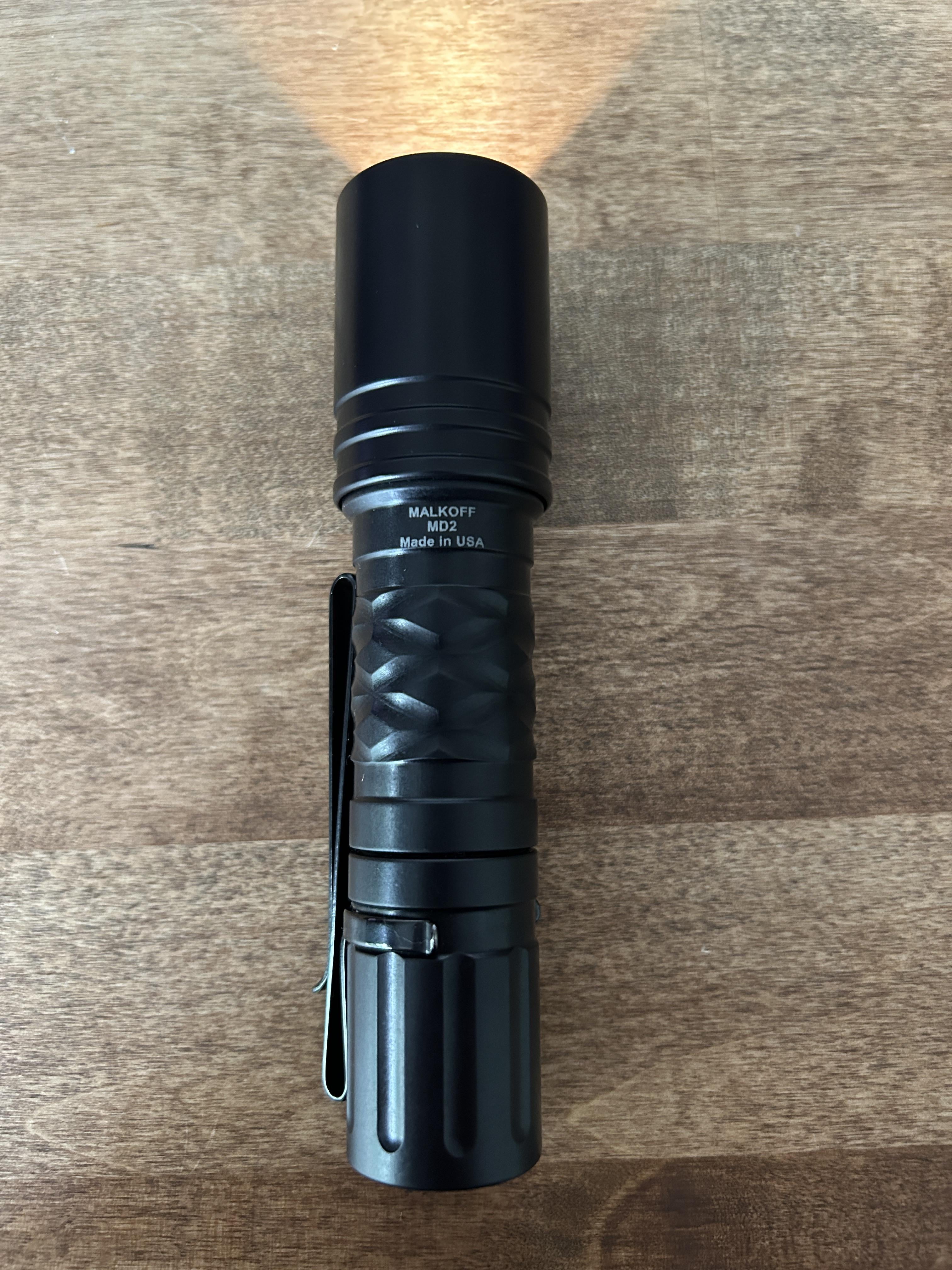 I have been looking for a no-nonsense dual-output light for edc/work. After a lot of research I was about to pull the trigger on the tried and true Streamlight 6X/pro, but I just wasn’t satisfied picking up a light that only ran 123As. I then stumbled on Malkoff and looked through their site for a couple hours and settled on the MD2. I chose the M61N led because I’m a big fan of neutral light. I don’t love cool white. The light just arrived this morning and I couldn’t be happier. It is a sturdy light and I am a fan of the high/low beam interface, though I would like to see that functionality on the tail cap instead of the head of the light. I threw on a pocket clip from my Olight M2R Warrior Pro, now it’s ready to rock and roll.