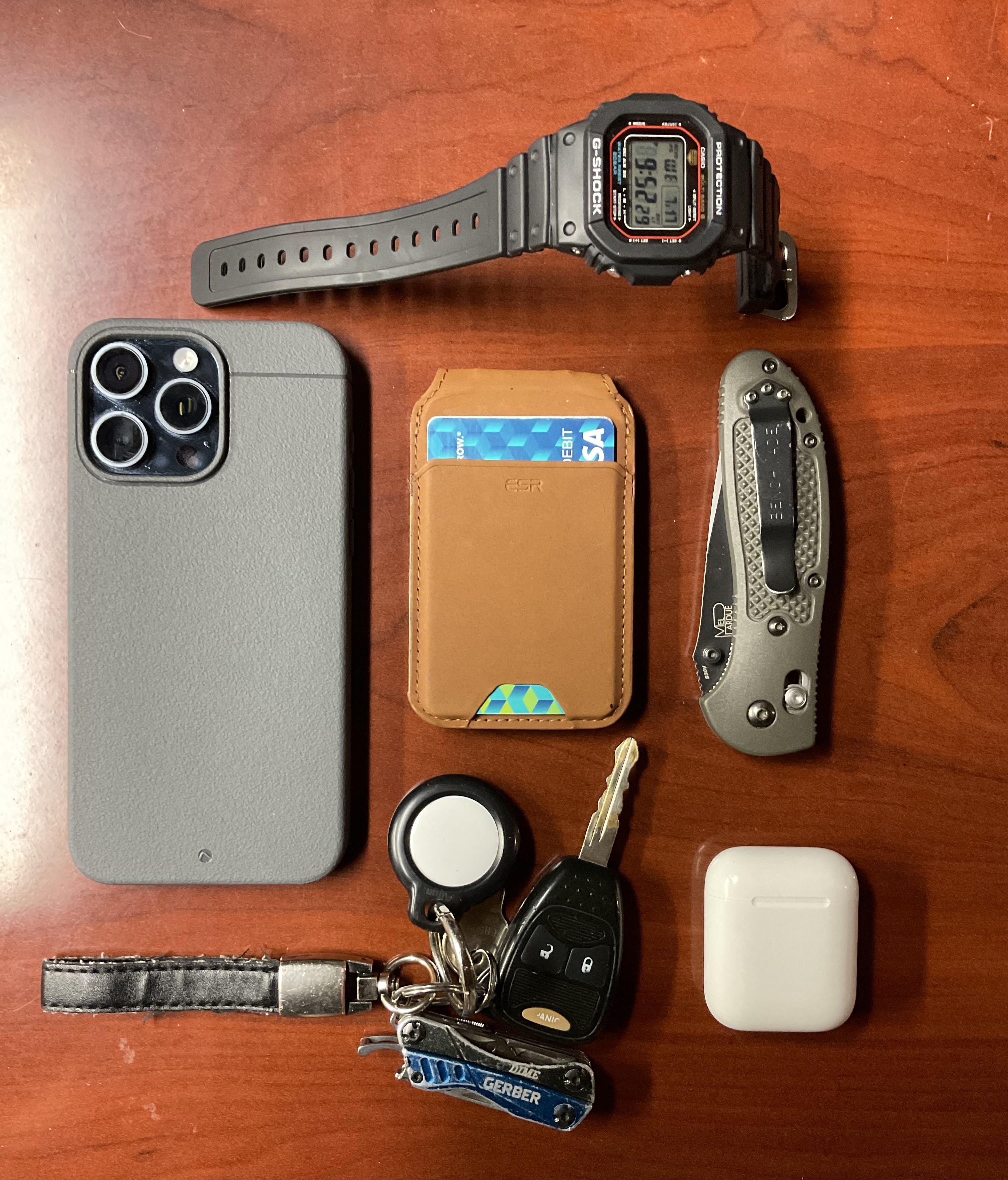 -iPhone 15 Pro Max with Caudabe Sheath case -ESR MagSafe wallet -Casio G-Shock GMW5610 watch -Benchmade Griptilian knife -AirPods 2nd Gen -AirTag -Gerber Dime -Truck keys