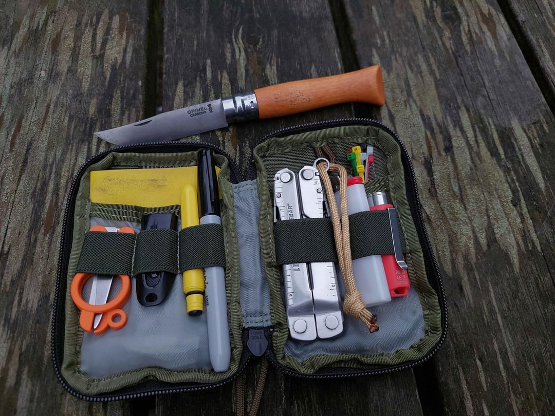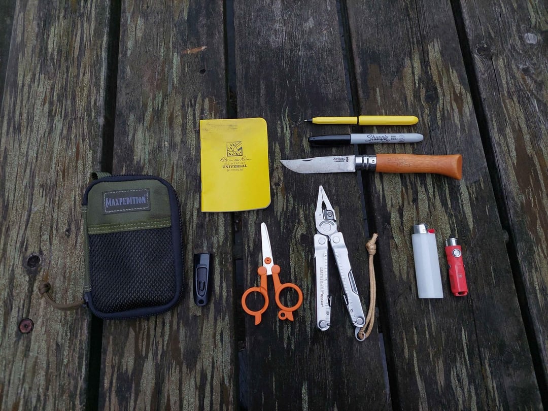 * Maxpedition Micro Pocket * Rite in the rain notebook * Fiskars classic folding scissors * Leatherman Rebar * Opinel no9 carbone * Rovyvon A1 flashlight * Pokka pen yellow * Sharpie * bic lighter * assortment of colorful zip ties * 128 gb sandisk thumb drive * not pictured: backup medication and hair ties inside the pouch