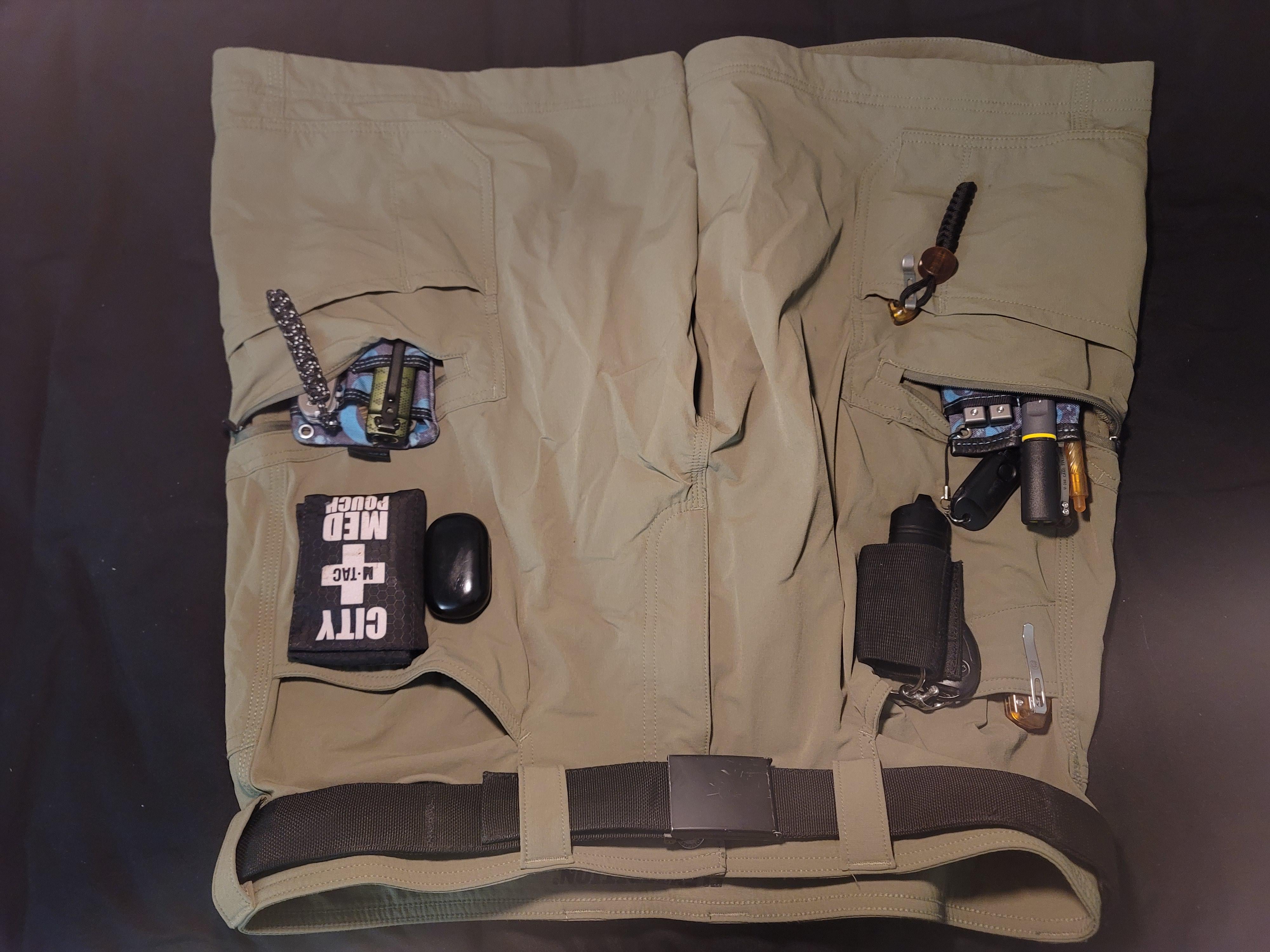 Gear listed in previous pocket dump… but basically includes keys, ifak, edc pouches, flashlight, multitool, prybar, marking implements, a sharpener, and two knives