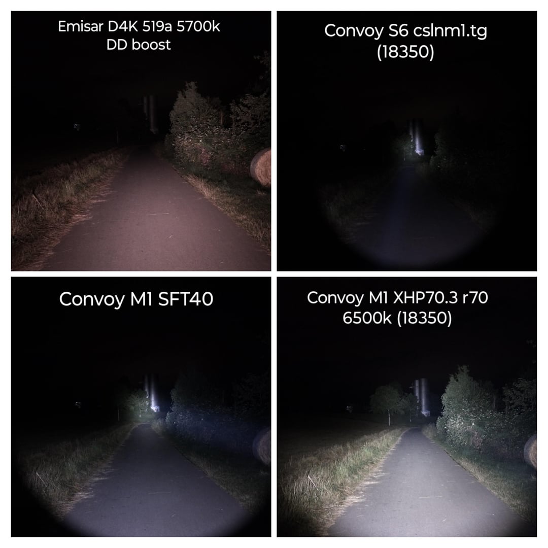 I got the M1 with XHP70.3 r70 6500k, the 6V5A driver and the 18350 tube. It is crazy bright for a light of that size and the efficiency of the cold, low cri emitter seems to help with the runtimes. The exposure and white balance was locked while taking the pictures.