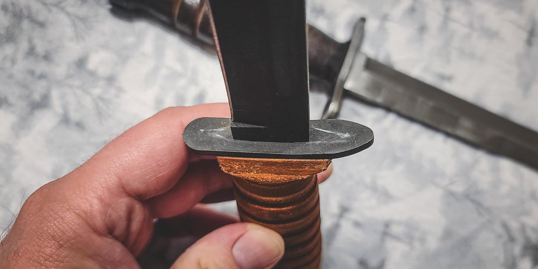 The blade is off center from the handle, something I’ve noticed in a few reviews. A couple reviews I saw said this was intentional so it could fit between ribs, it’s not. The blade was to be centered in the grip so it could be a “grab and stab” no matter the orientation. (The “offset blade to fit between ribs” was a rumor for the Gerber Mk II’s “bend” that allowed it to be carried closer to the body, on the leg, or in a boot and still be easier to grab.)