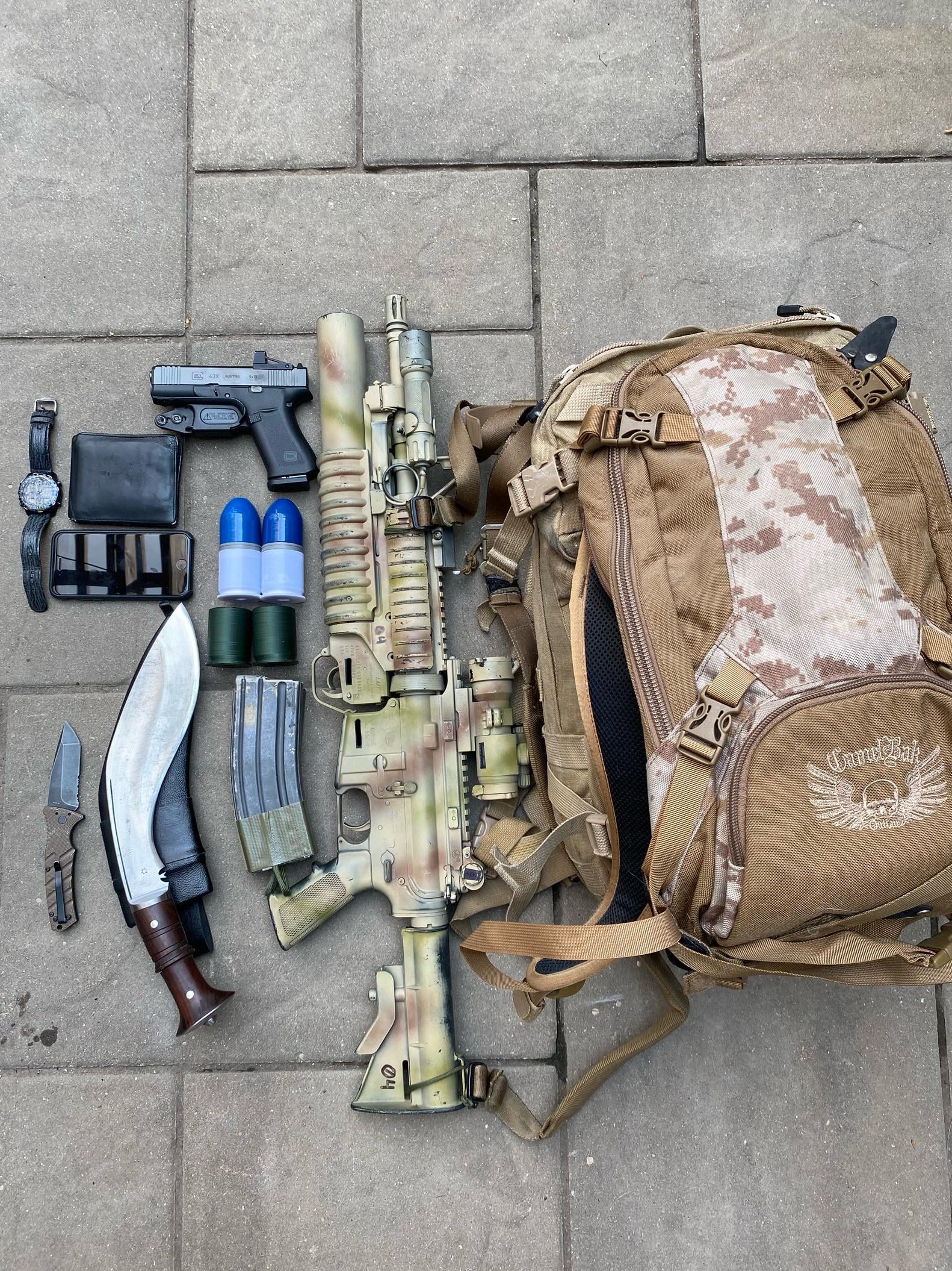 Some old desert tan assault bag with CamelBak, Colt AR with goodies, Glock 43X, Kailash Blades kukri, some random Gerber knife, iPhone, generic leather wallet, and an old Citizen Blue Angel. Ray-Ban Aviators and Surefire G2 not pictured.