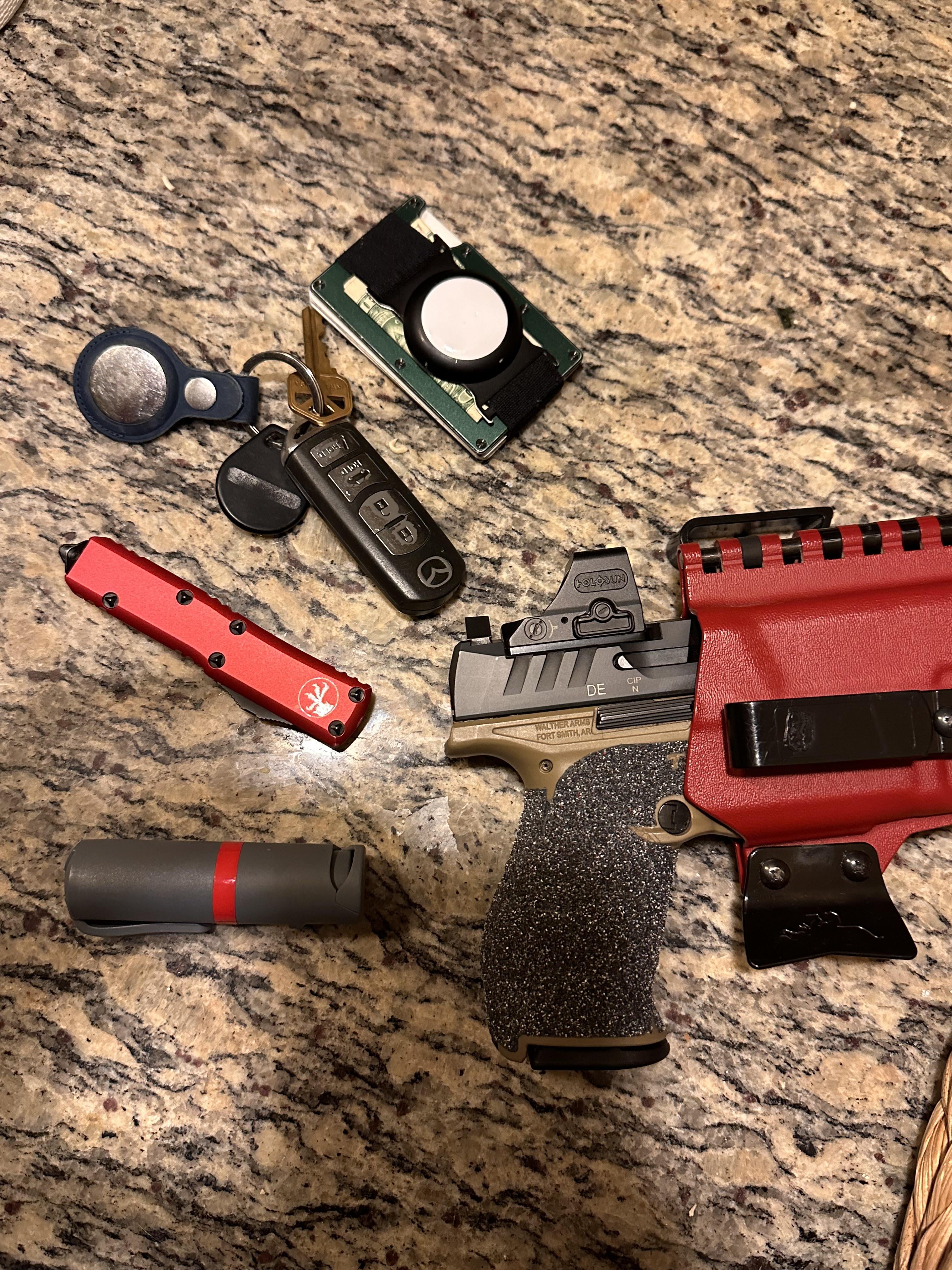 Taken with my iphone- ridge Wallet and Mazda 6, microtech UTX-85 (been leaving this in my bag honestly), POM pepper spray and Walther PDP in trex sidecar holster if walking around downtown/walking dogs late or something-