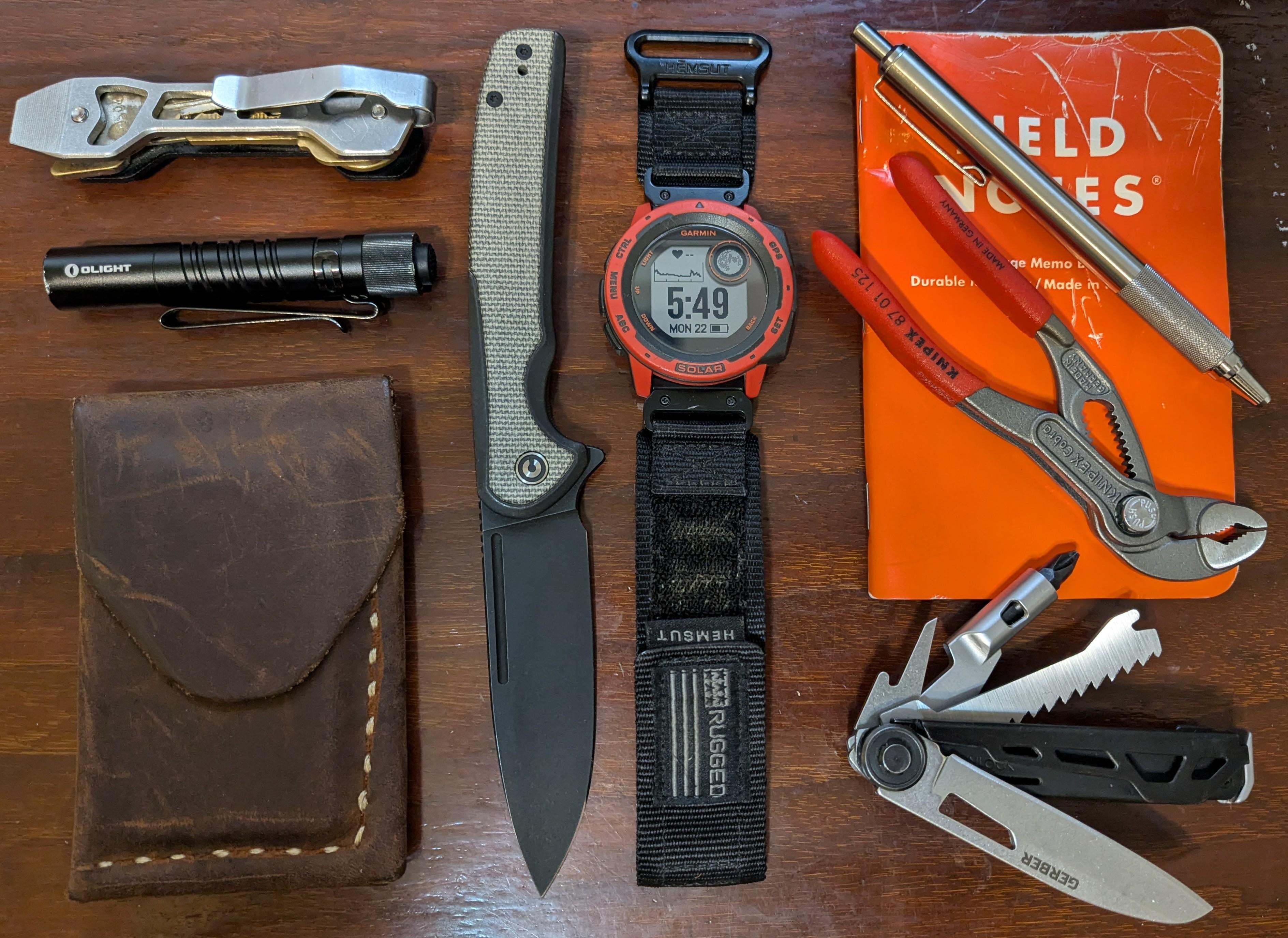 Trayvax key/pry bar, Olight i3T, Homemade wallet based on JW Leathersmith Lucais wallet, Civivi Voltaic, Garmin Instinct Solar 2 with Hemsut Rugged nylon band, Zebra F-701, Knipex 5 in Cobra Pliers, Field Notes Expedition memo book, Gerber Armbar Trade.