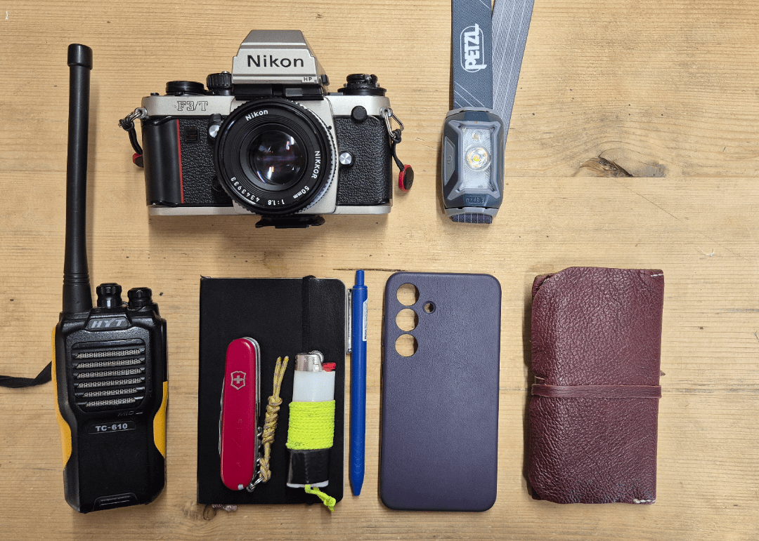 – Victorinox camper – bic lighter – tobacco leather pouch I made – Petzl Tikka 350 – Nikon F3T – HYT tc-610 two way radio – random ballpoint pen – Samsung S24 – notebook