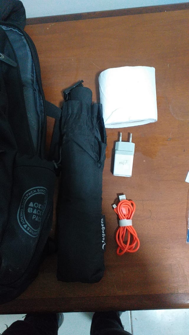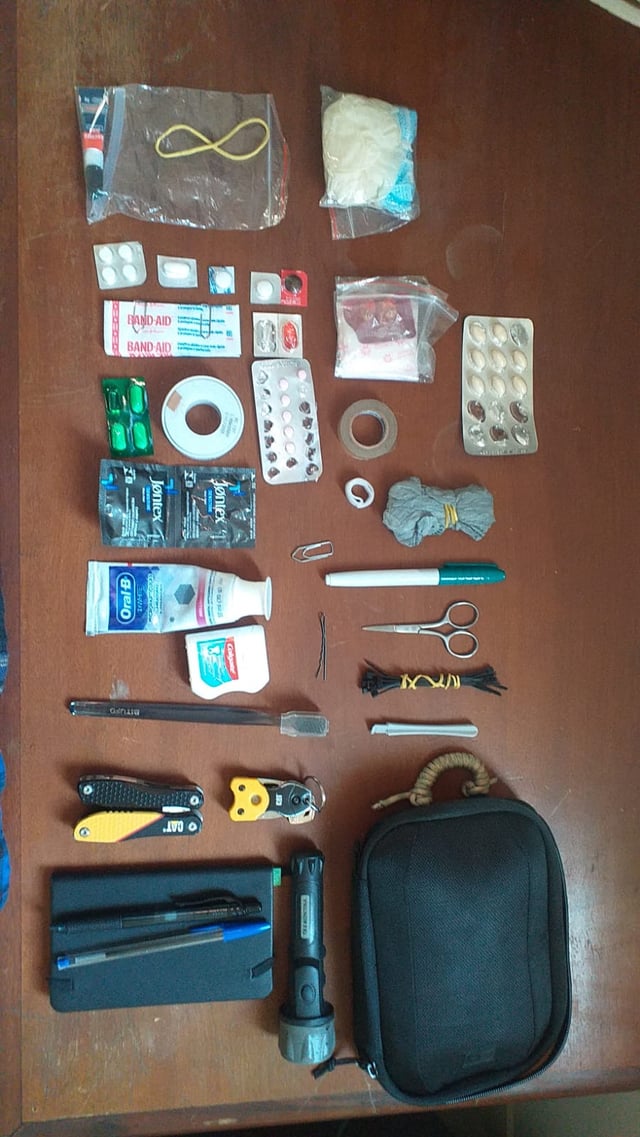 Fake brand organizer Flashlight small notebook bic pen, blue other pen, black Caterpillar Multitool Caterpillar keychain that came with the multitool Toothbrush Dental floss Toothpaste zipties little gray thingy for prying things that aren’t mine and i can’t break with the multitool small scissors for when people need scissors and i don’t want to lose my nice stuff green off-brand sharpie for sniffing paper clip for roleplaying as a creative person Condoms i don’t use Medicine i pray to not use Plastic bags for bagging tape Baggy with gloves and mask Baggy with hot glue thingy and glue Umbrella Charger Cable for said Charger Bag