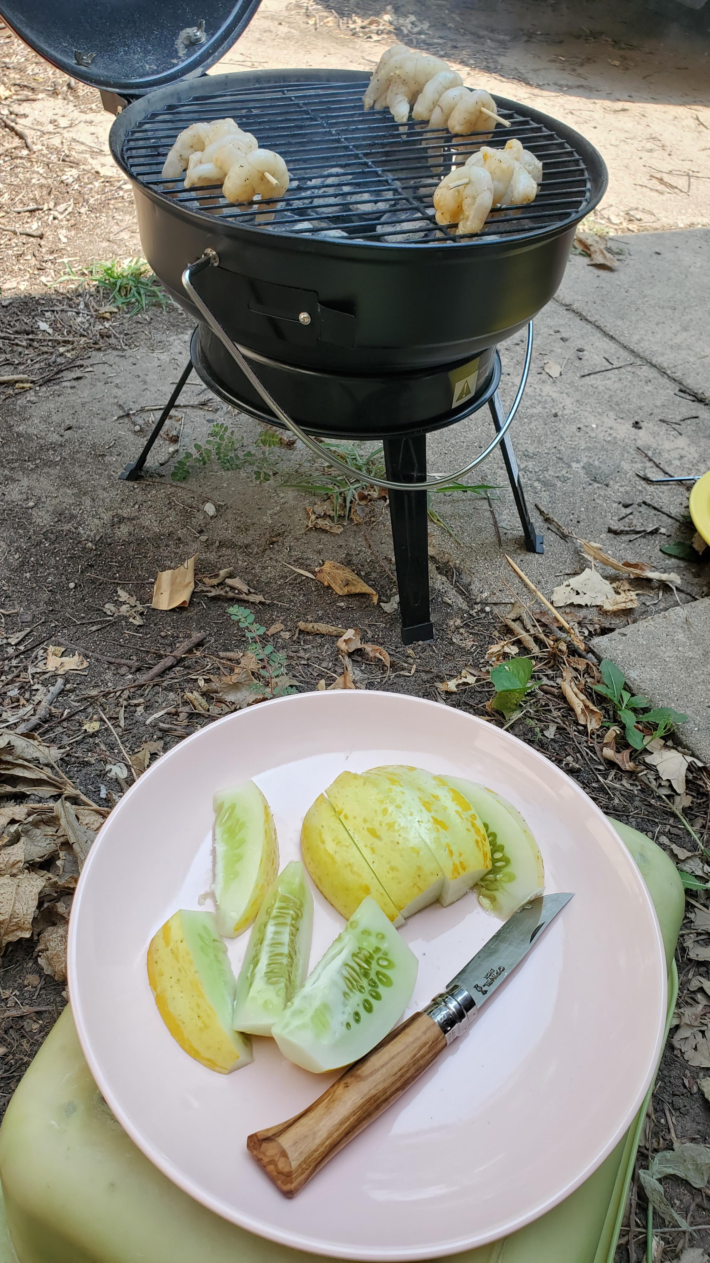 Shrimp on grill and lemon cucumber for lunch with friend.