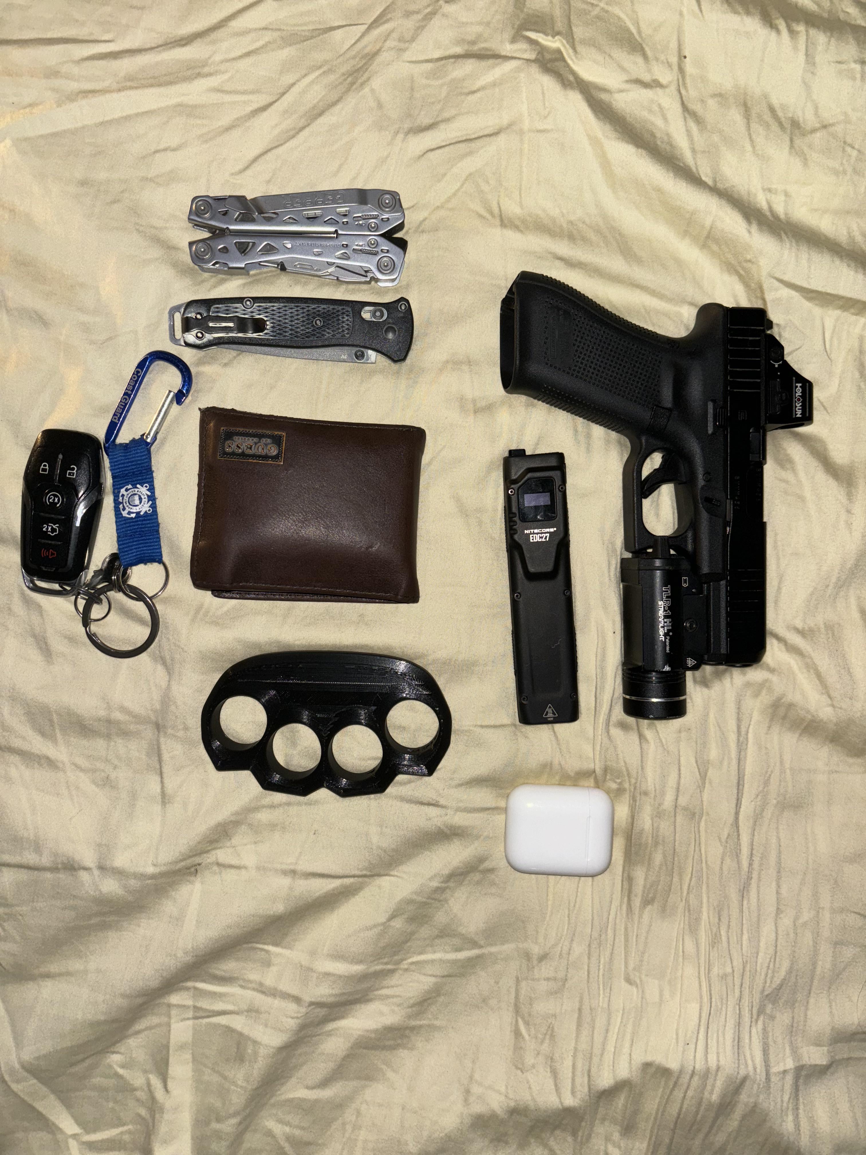 Keys Gerber NXT Benchmade Bailout Guess leather wallet No Metal Knucks polymer knuckles Nitecore EDC 27 Gen 1 Airpods Glock 45 (Holosun 407a3, Streamlight TLR-1 HL)