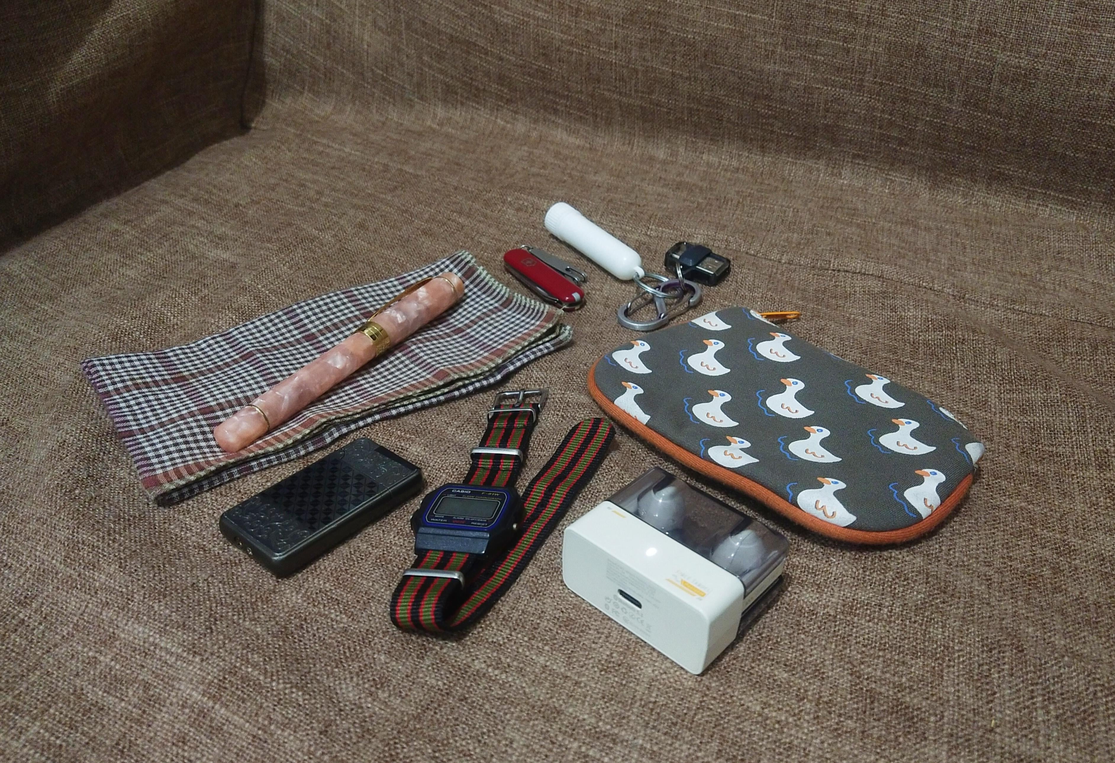 * Victorinox Classic SD * Vicks unmedicated inhaler * SanDisk OTG flashdrive * Hanky of unidentified origin * Jinhao 100 * Random torch lighter * Casio F-91W on a NATO * Artwork goose wallet * Moondrop Space Travel