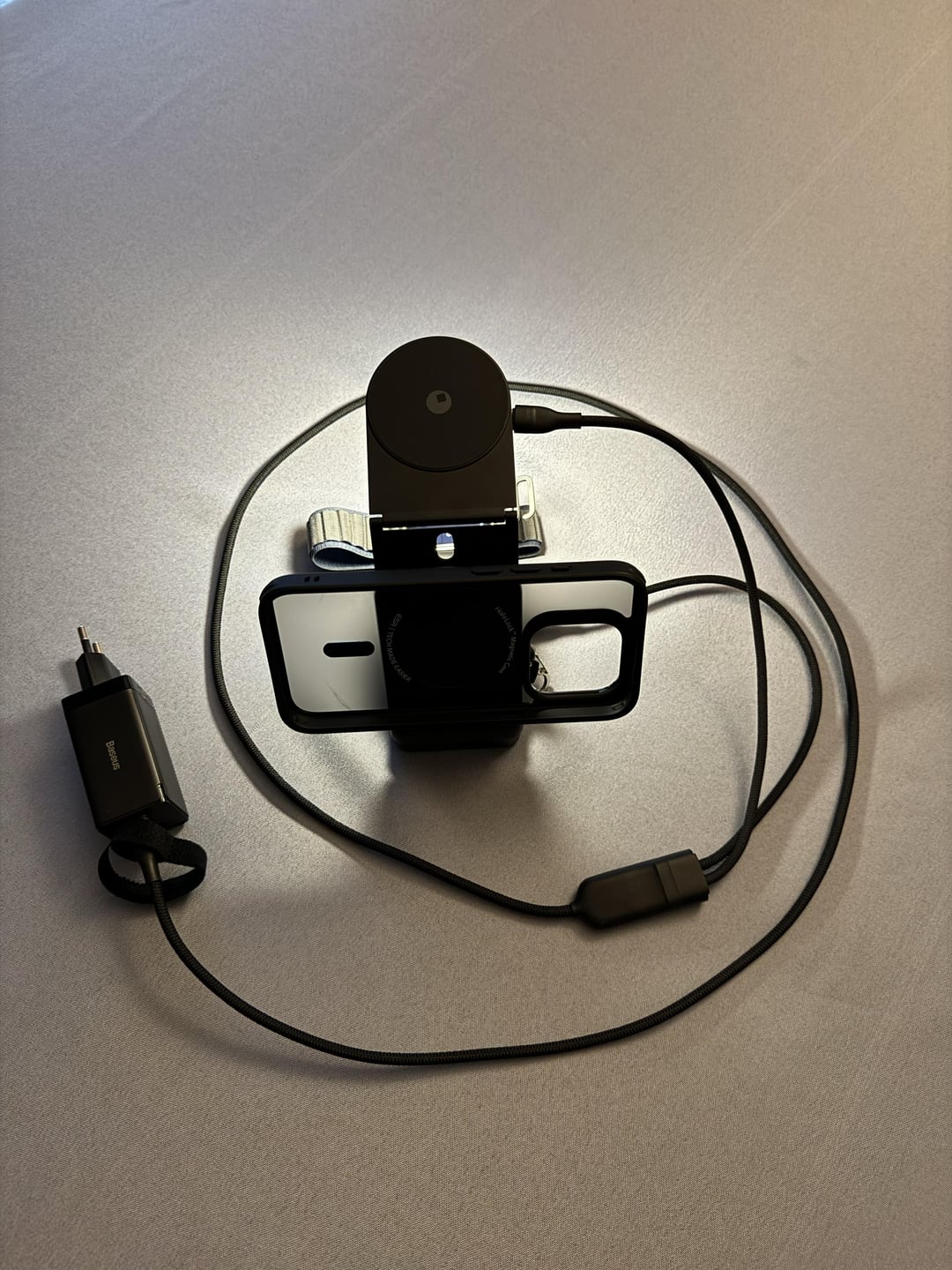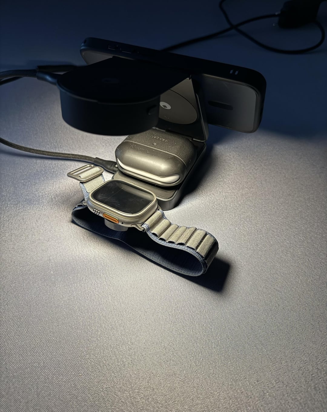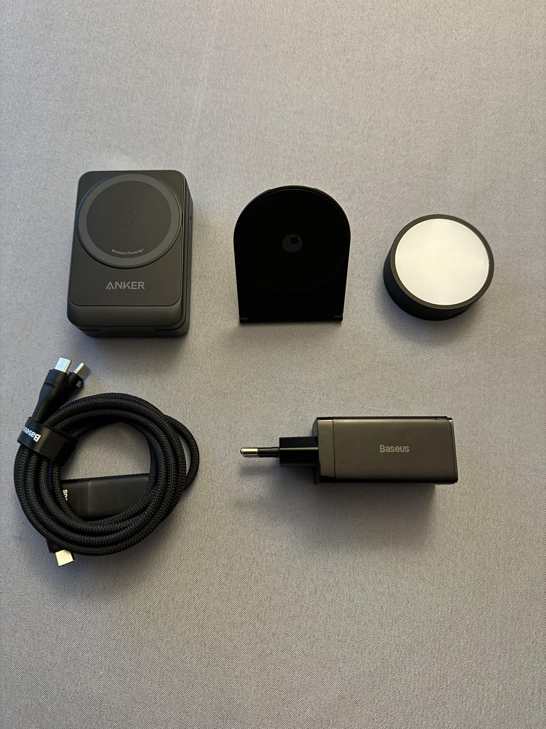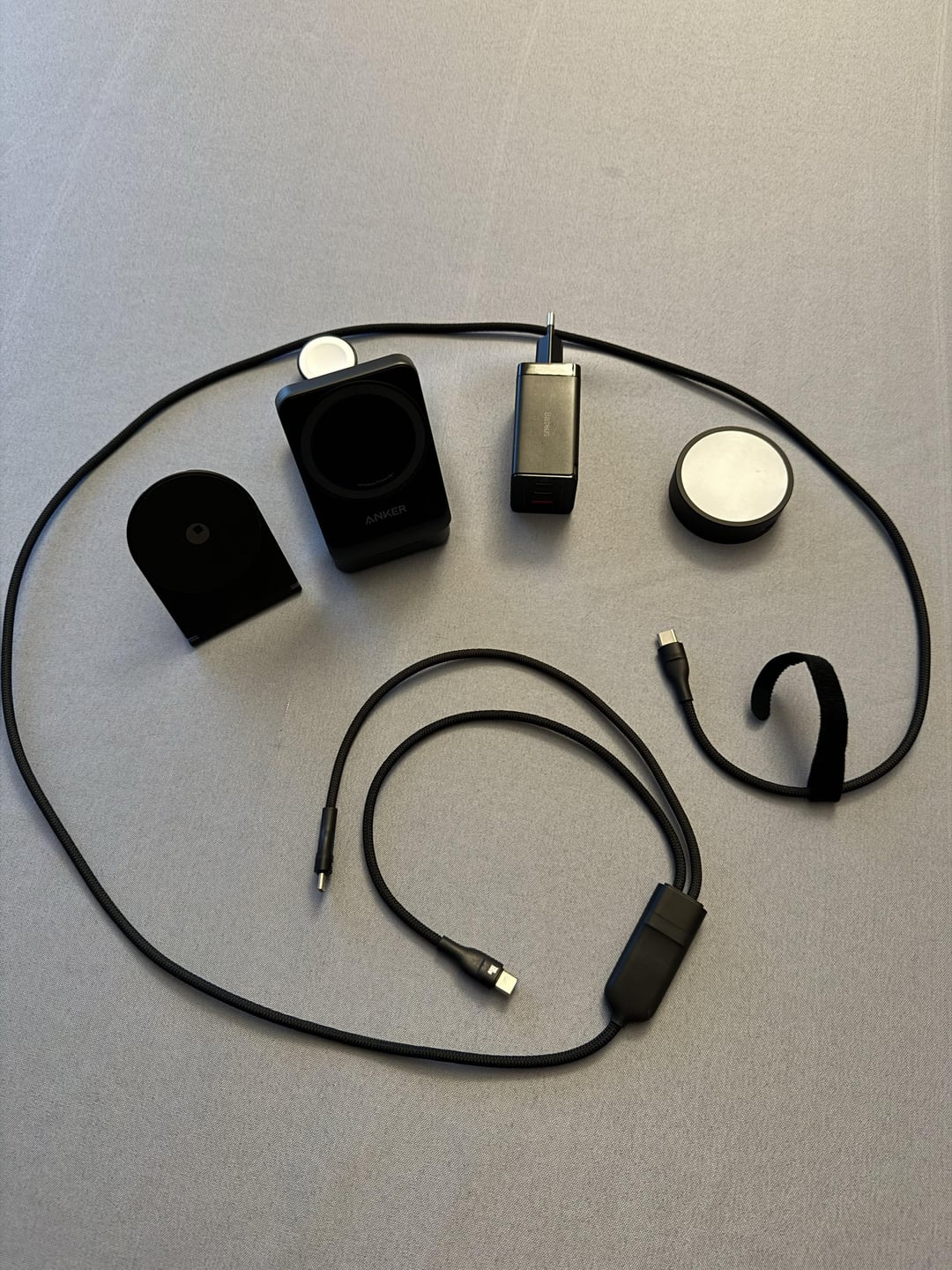 – Anker 3 in 1 – Rolling Square Edge pro core + light ( battery for 4H ) – Baseus charger 65W + USB C 2 in 1 ( for MacBook Air ) – iPhone 15 Pro – Apple Watch Ultra 2 – AirPod pro 2