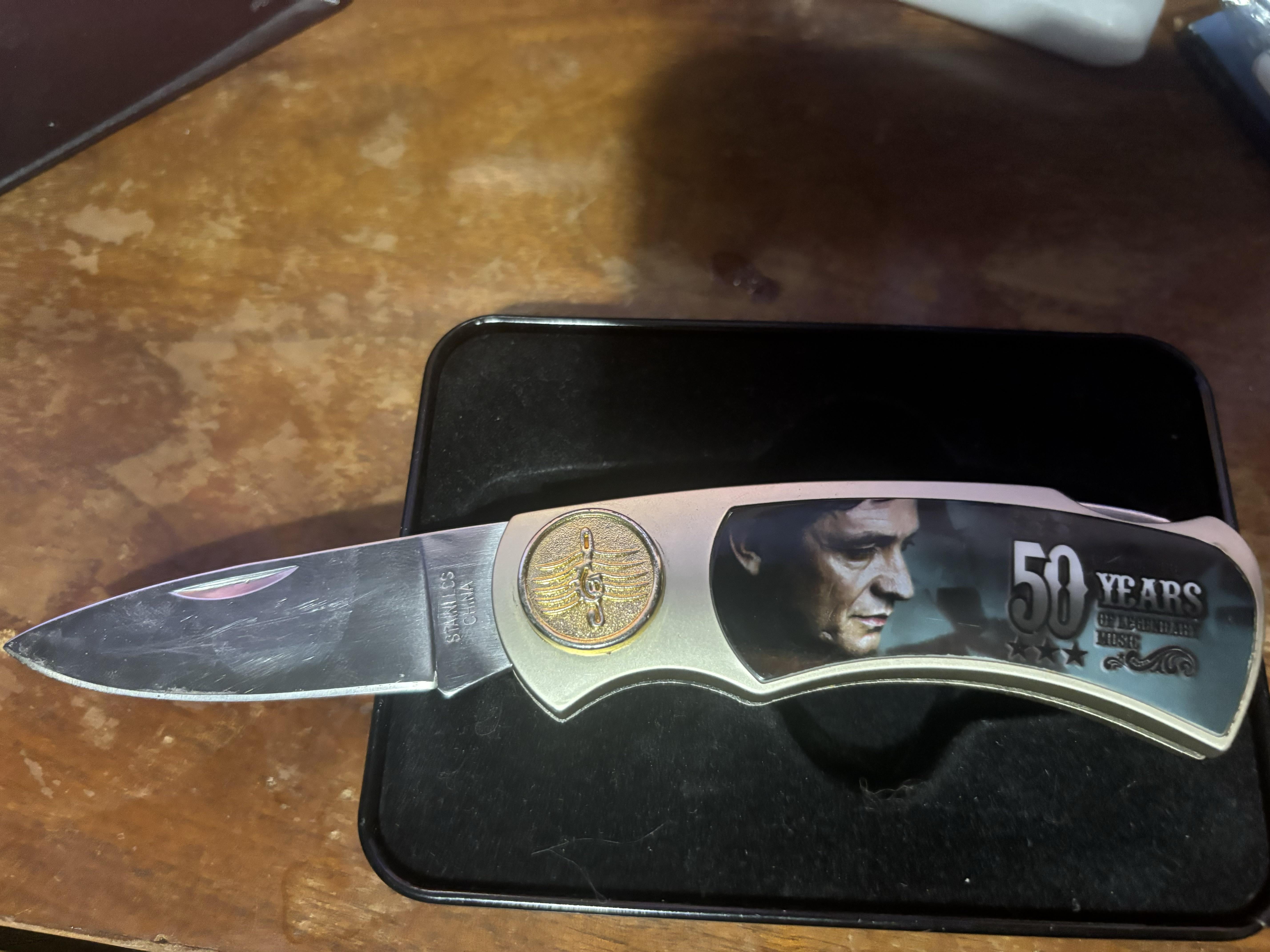 Press the metal sticking up down where the dip is on the handle above the 50 years and the lock will release and you can close it like a standard friction folder it’s called a lock back knife.