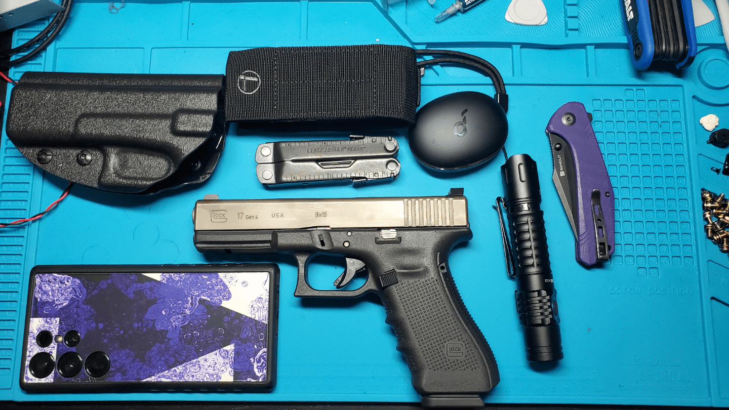 Wurkos FC12, Glock 17, Leatherman Rebar, Sencut Actium, Anker Soundcore Liberty 3 Pro, S23U dbrand GRIP case.