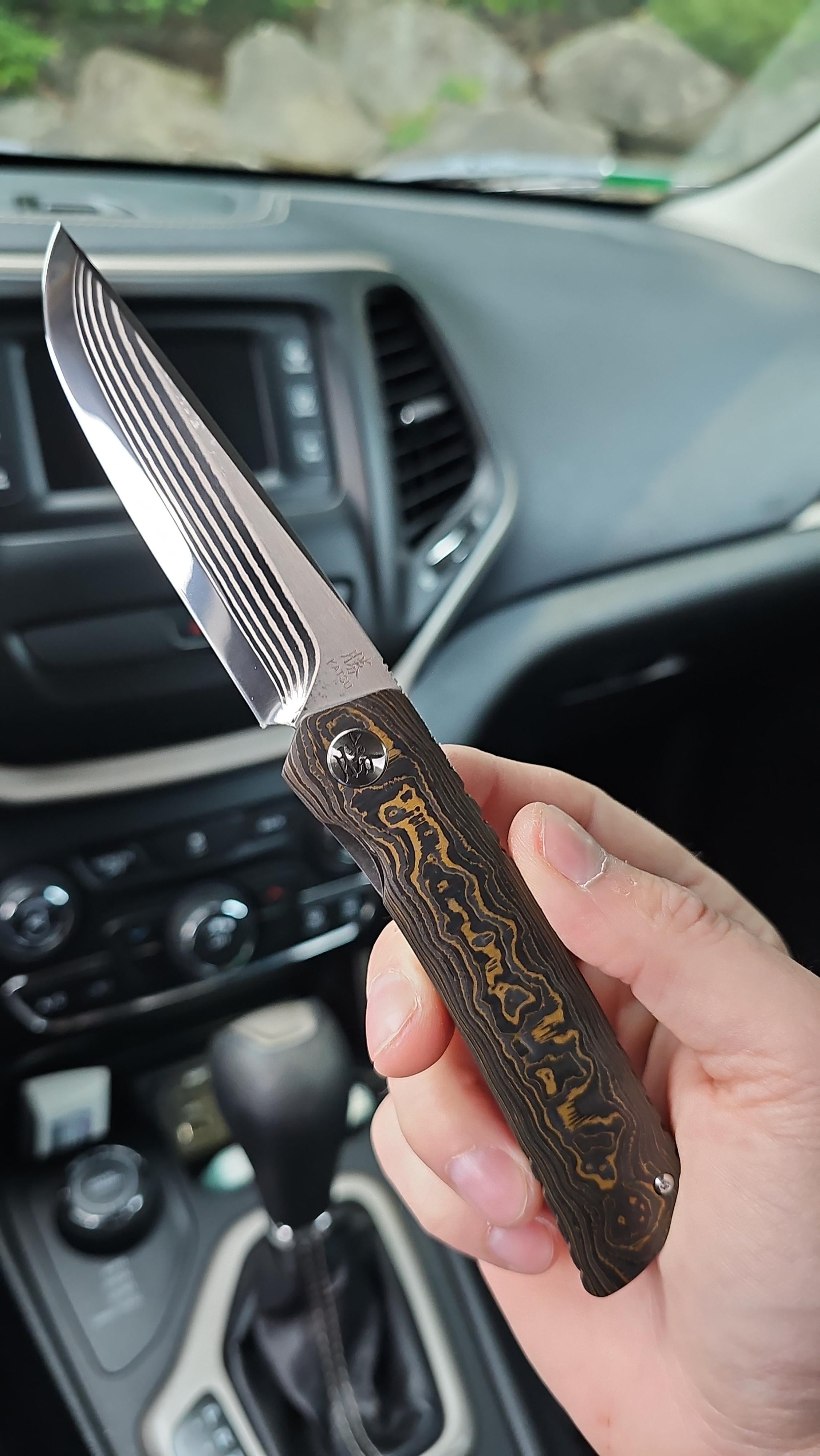 Katsu KZ-04 in ZDP-189 with the gold/copper camo fat carbon. This knife is a perfect example of why I enjoy doing these posts, learned about them on one of my previous posts. This knife is exquisite, like a Rockstead I didnt have to sell a kidney for. Fit and finish is stunning, blade is centered and action smooth. The layered ZDP mirror finished blade is gorgeous. This will not be my laat Katsu, super bummed I missed the Timascus version of this model.
